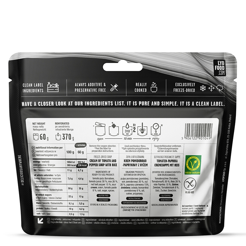 V balení nejsou žádné umělé přísady, žádné přidané cukry, žádný palmový olej a žádné konzervační látky. Jídlo je vyrobeno ze 100% přírodních surovin. Doba spotřeby jsou cca 4 roky.