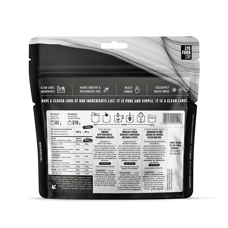 Proč byste měli LYO Five-Spice Chicken ochutnat? Tak za prvé proto, jaký skvělý je to mix! Bambusové výhonky, mungo klíčky, Jídášovo ucho se sójovou omáčkou jsou podávány s rýží, šťavnatými kousky kuřecích prsou, zeleninou a typickou směsí koření, se kterou se budete cítit jako ve vaší oblíbené čínské restauraci. Za druhé, toto jídlo by nemohlo být tak dobré, kdyby nebylo uvařeno klasickým kuchařským způsobem! Před lyofilizací vaříme naše jídla v malých dávkách, aby si zachovala svou lahodnou a autentickou chuť. Pro ty dlouhé a vyčerpávající dny strávené venku je LYO Five-Spice Chicken perfektní palivo, které vás udrží v chodu.