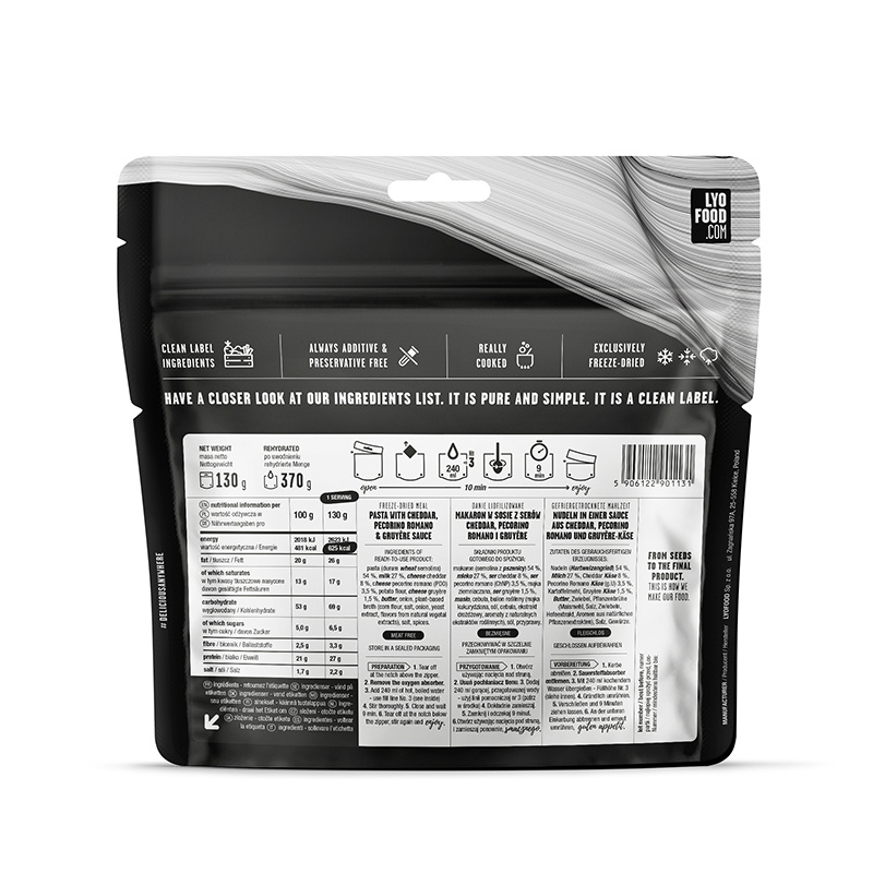 Pokud věříte, že sýr dokáže každé jídlo chuťově vylepšit, nejste sami. Nyní můžete uspokojit své chutě i při vícedenních expedicích. LYO Mac&Cheese je moderní verzí oblíbené klasiky: pšeničné makaronové těstoviny zalité v omáčce ze sýrové kombinace anglického Cheddaru, italského Pecorino romana (tvrdý sýr z nepasterovaného ovčího mléka) a švýcarského sýru Gruyere (z nepasterizovaného kravského mléka). Krémová textura a prolínající se chutě svedou vaše mlsné jazýčky a udělají jakoukoli venkovní večeři ještě vzrušující. Perfektní volba pro dobrodruhy, kterým nevadí dlouhé cestování a nesnesou nudné jídlo.