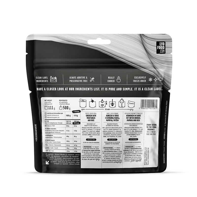 V balení nejsou žádné umělé přísady, žádné přidané cukry, žádný palmový olej a žádné konzervační látky. Jídlo je vyrobeno ze 100% přírodních surovin. Doba spotřeby jsou cca 4 roky.