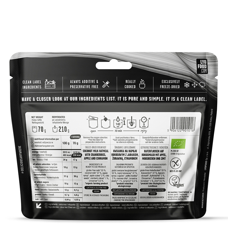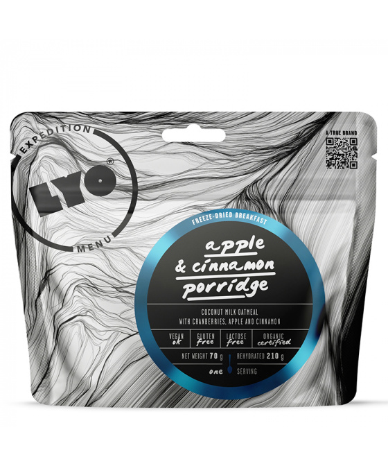 Nebeský souboj chuti a vůně! Zejména v chladnějších měsících je jen málo věcí tak uklidňujících jako klasická kombinace sladkých jablek a skořice. Tuto unikátní variaci jsme do naší nabídky prostě museli zahrnou a navíc jsme ji vylepšili kombinací s kokosovým mlékem, bezlepkovým ovsem, chia semínky a brusinkami, čímž se nám podařilo vytvořit hřejivou snídani s lahodnou vůní. Díky 100% organickým ingrediencím bez umělých přísad chutná naše kaše tak, jako byste si ji právě doma připravili, ale díky naší technologii lyofilizace si ji můžete vychutnat kdekoli.