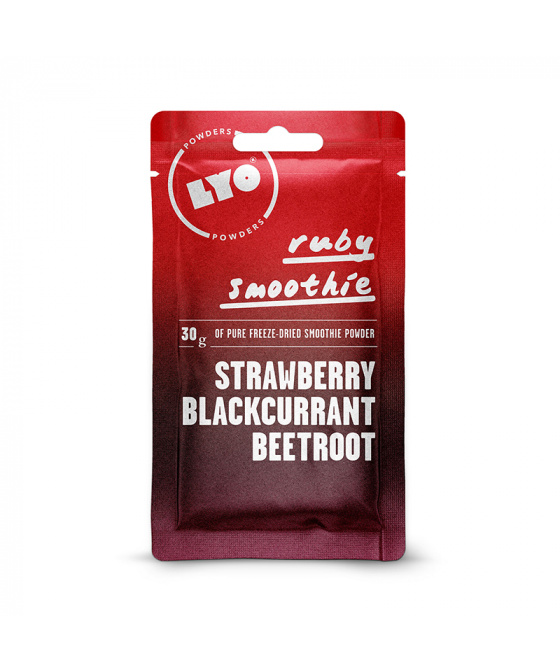 Vysoce kvalitní suroviny, bez konzervantů, bez umělých přísad, bez přidaného cukru. Zkrátka nekompromisní kombinace ovoce a zeleniny pro milovníky smoothie. Kombinace sladkých jahod a červené řepy zakončená lehce kyselým tónem černého rybízu vytváří skutečně výbušnou chuť! Vše připravené v praktickém sáčku. Smoothie LYO dodá vašemu rušnému pracovnímu dni nebo vašemu menu při objevování divočiny šmrnc. Skvěle také doplní jídelníček aktivních dětí a vybíravých jedlíků starších 3 let.