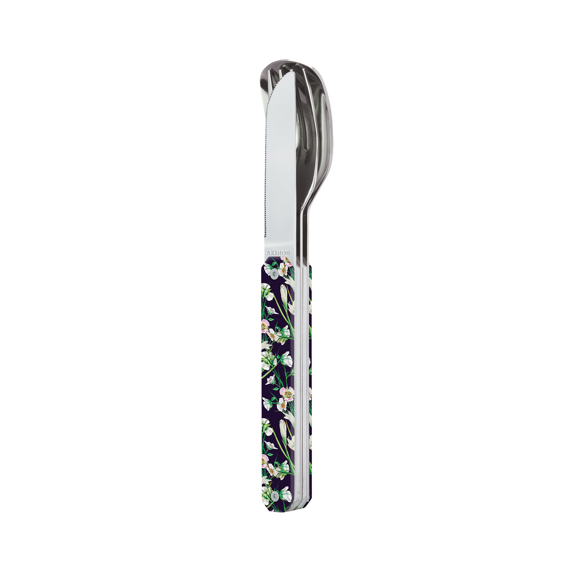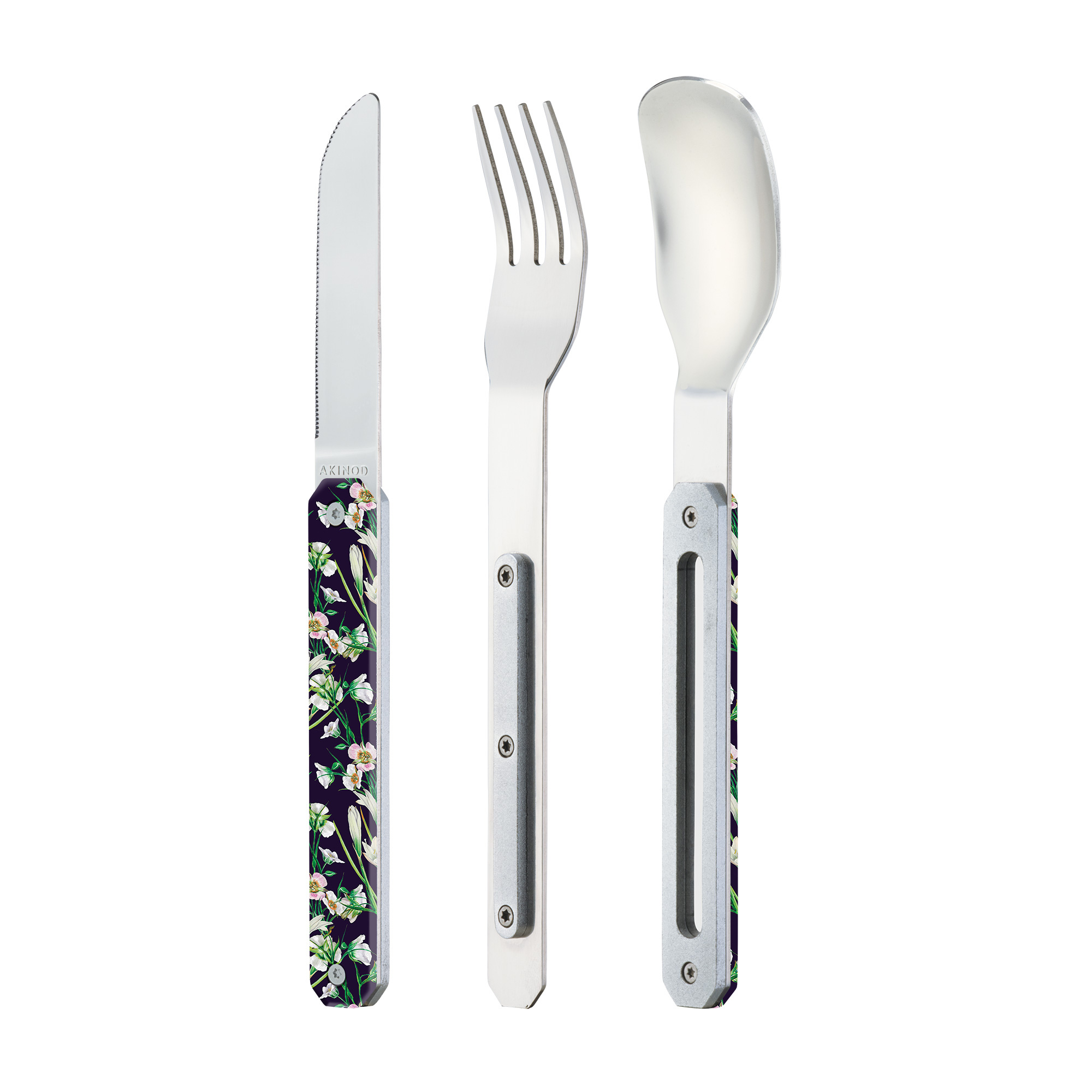 Cestovatelský magnetický příborový set v moderním designu s odolnou polymerovou rukojetí.