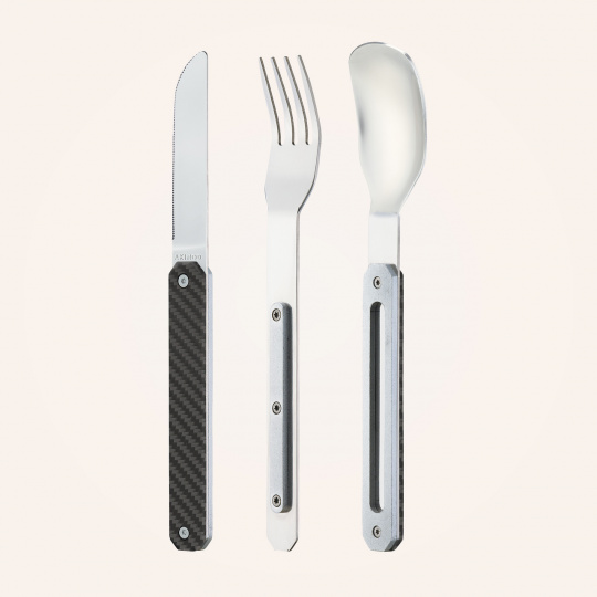 Cestovatelský magnetický příborový set v moderním designu s odolnou polymerovou rukojetí.