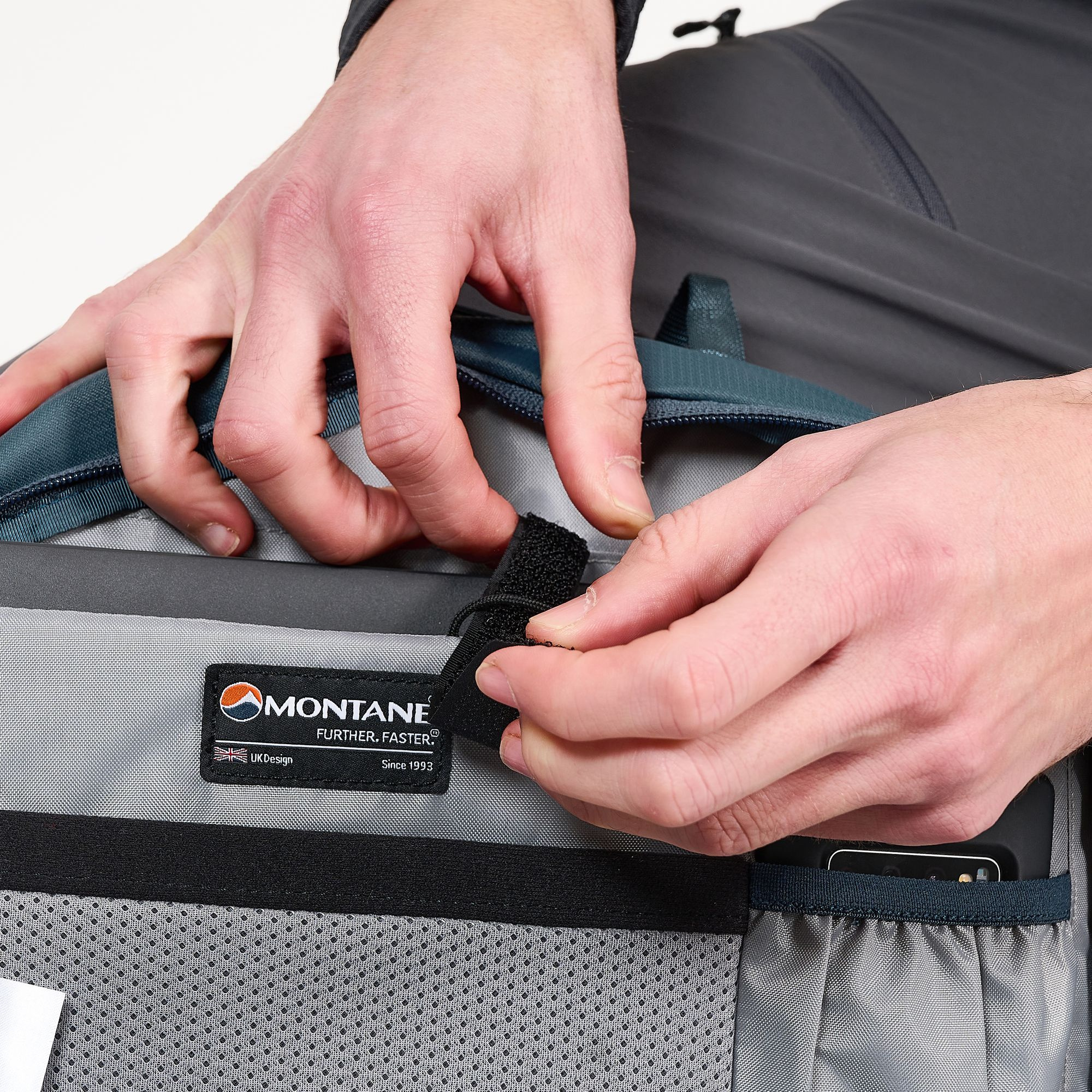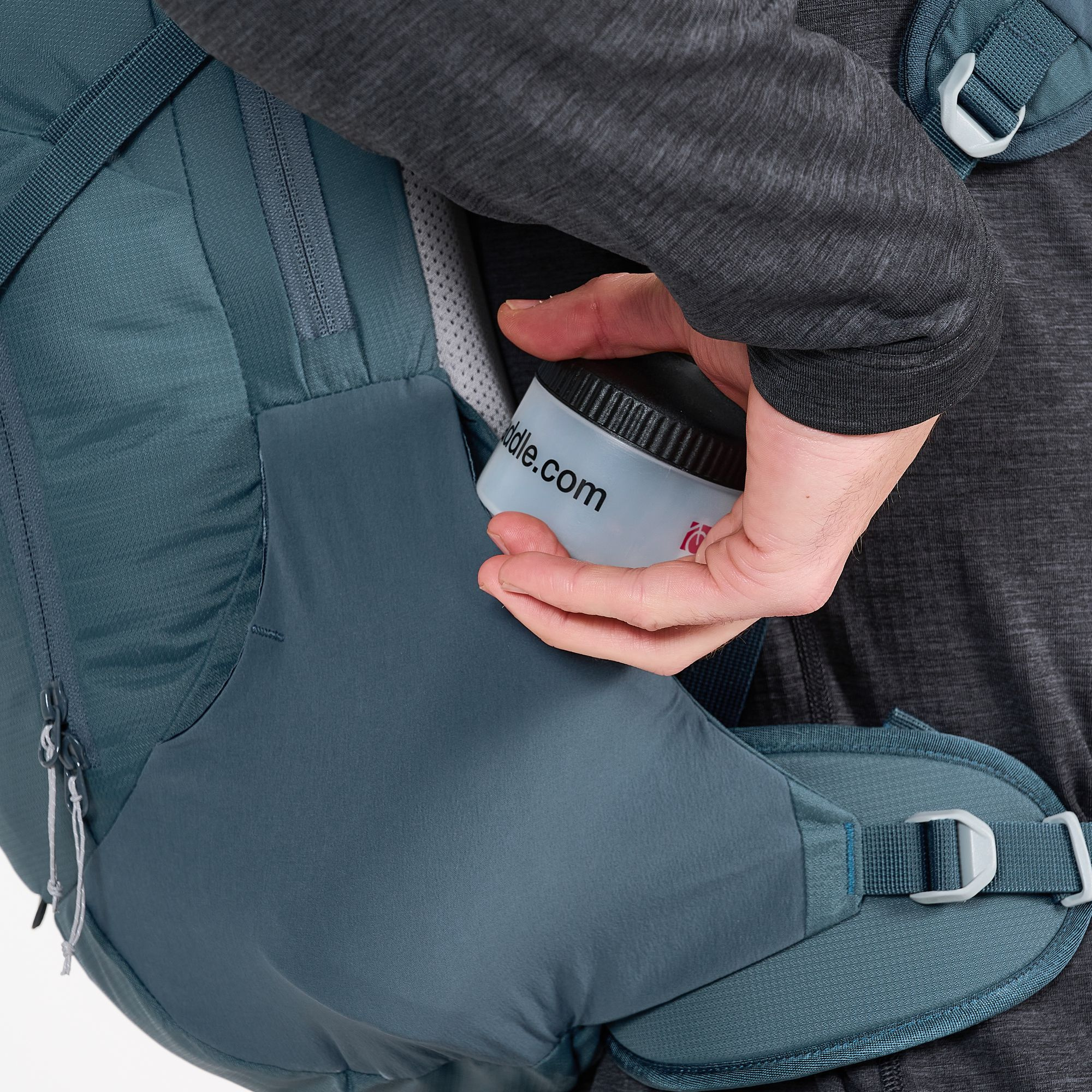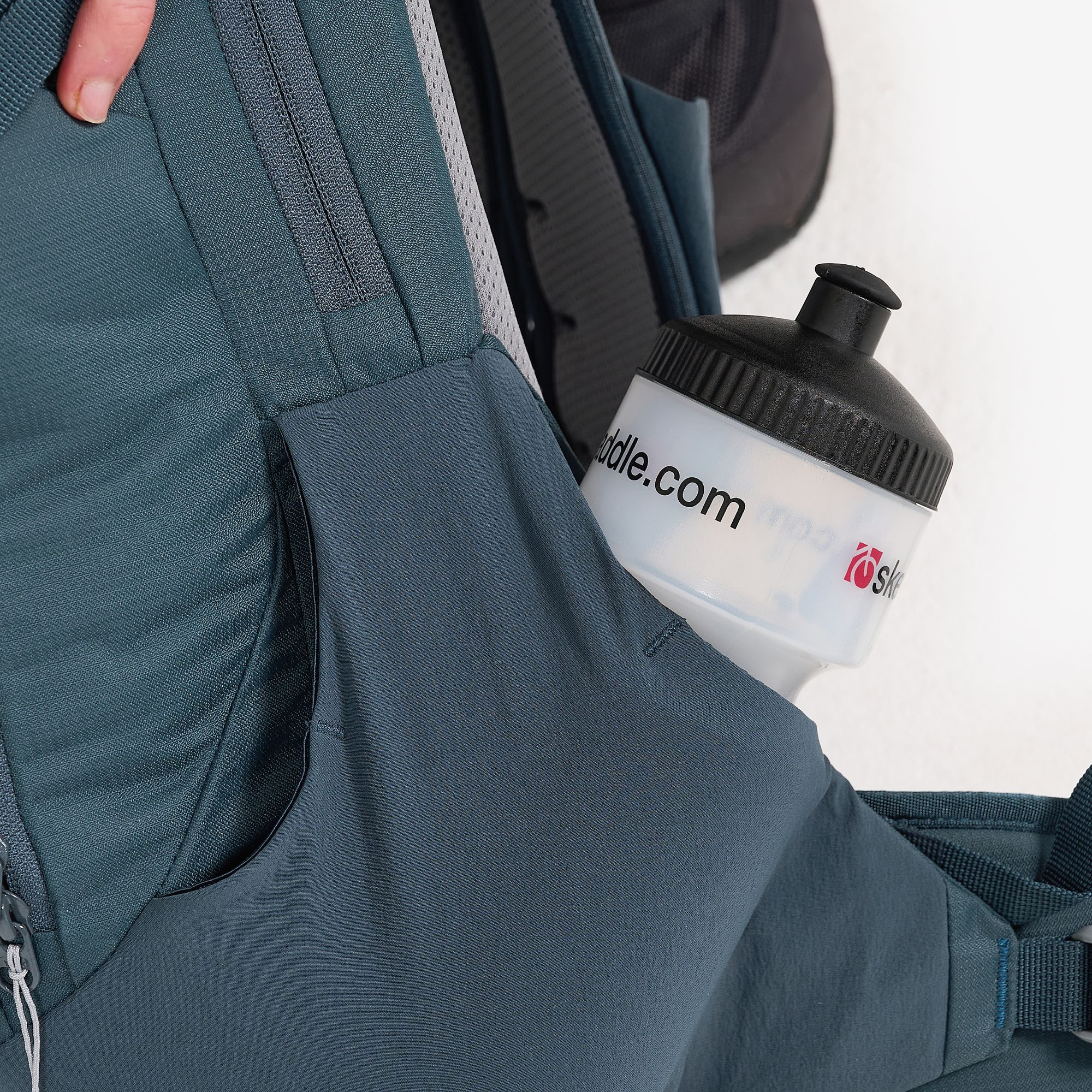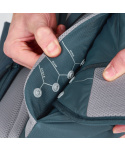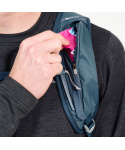 - Boční kapsy napojující se na bederní pás, jedna na zip, s klipem na klíče uvniř, druhá otevřená (např. na pitnou láhev)