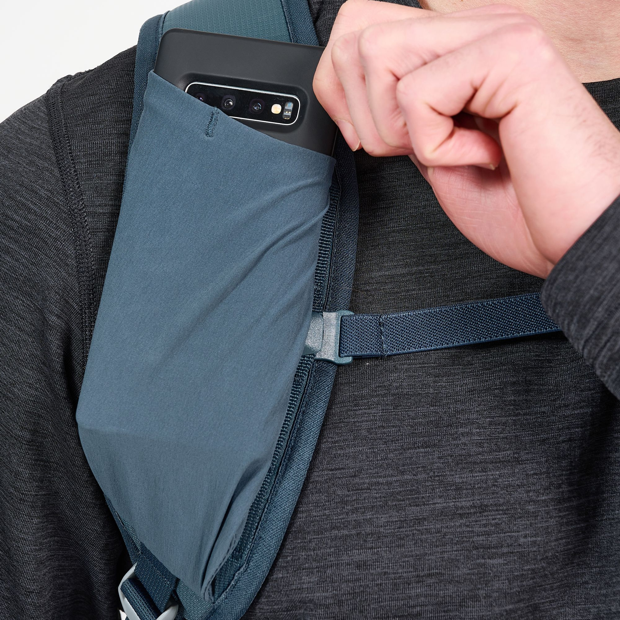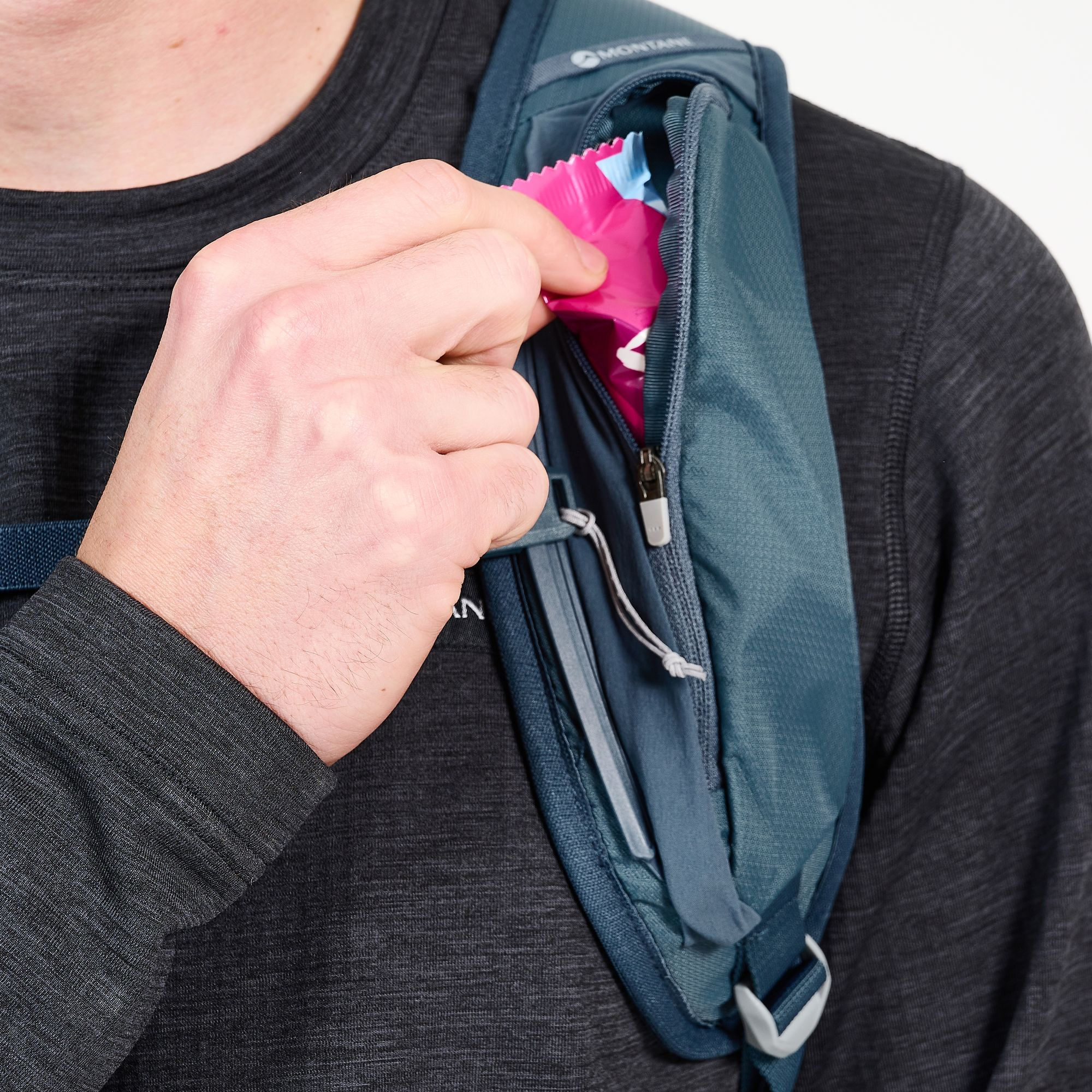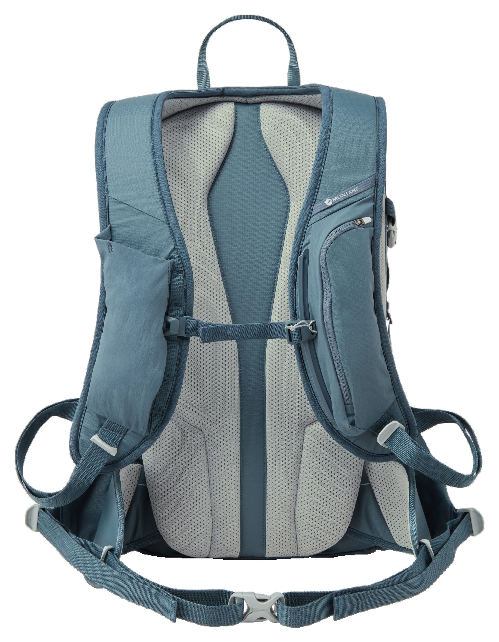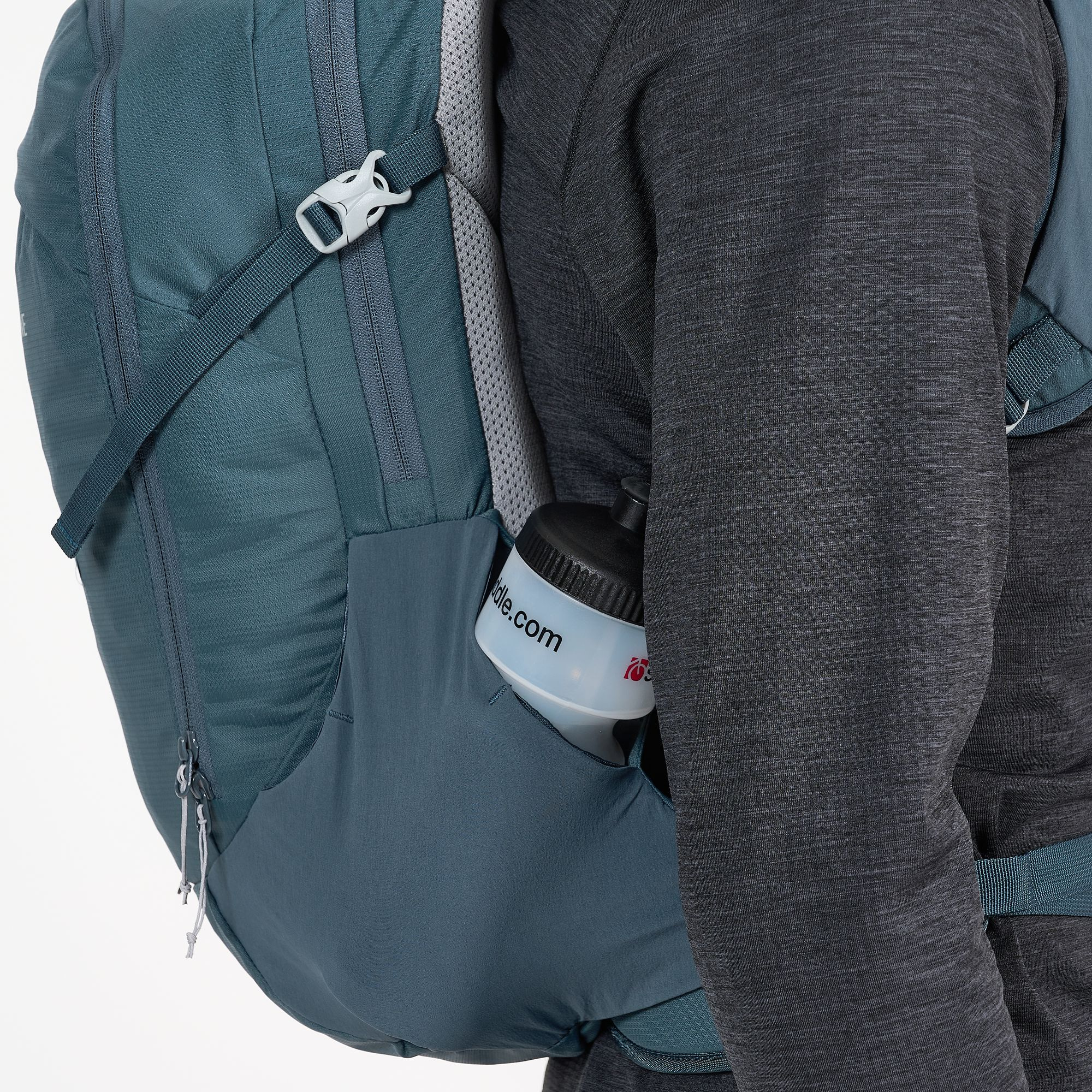 - Boční kapsy napojující se na bederní pás, jedna na zip, s klipem na klíče uvniř, druhá otevřená (např. na pitnou láhev)