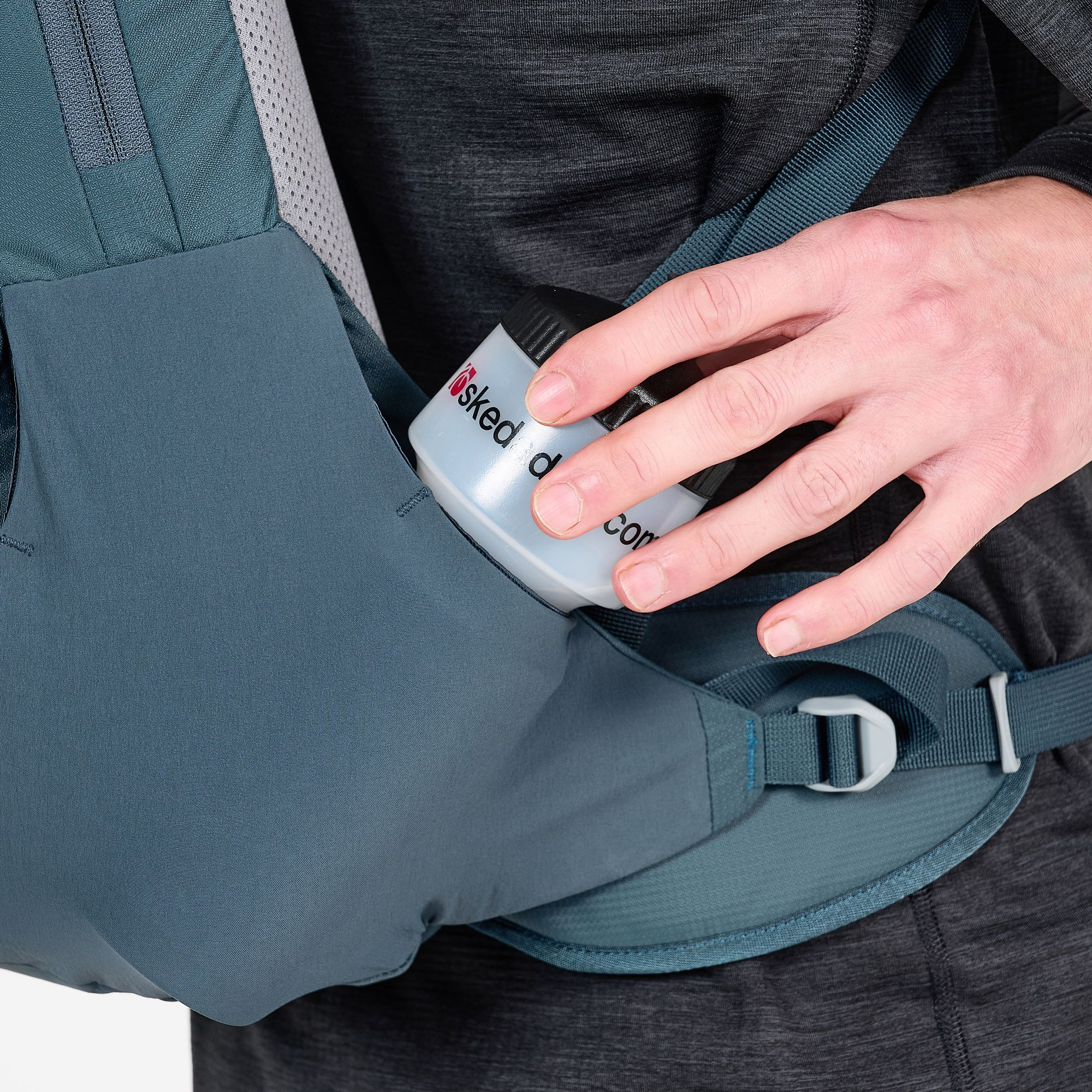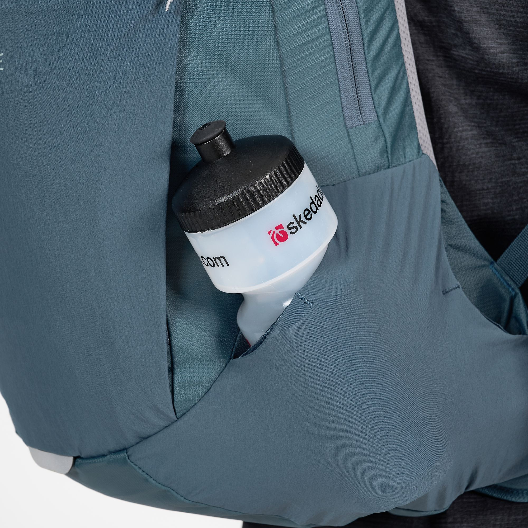 - Boční kapsy napojující se na bederní pás, jedna na zip, s klipem na klíče uvniř, druhá otevřená (např. na pitnou láhev)