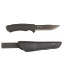 Švédský nůž velmi vysoké kvality s typickou skandinávskou čepelí. Nůž spojený s uměním přežití v divočině a jejímu porozumění, ale i s pohodlným pobytem v přírodě. Nůž je optimálně adaptovaný na procvičování dovedností při přežití, jako je rozdělání ohně, stopování, lov a rybolov nebo vybudování přístřeší. Čepel je vyrobena z německé uhlíkové oceli, která déle drží ostrost, a kalená na HRC 57,5. Ostří je potažené černou vrstvou, která chrání proti korozi. Horní část čepele lze použít jako ocílku spolu s magnéziovým podpalovačem pro rozdělání ohně, hrana čepele je speciálně pro tento účel naostřena. Solidní, masivní trn poskytuje maximální odolnost proti nárazu. Ergonomicky tvarovaná rukojeť s vroubky je vyrobená z odolného plastu černé barvy. Rukojeť je potažena vrstvou měkké přilnavé pryže, odolné proti skluzu. Záštita o délce 3,5 cm zabraňuje sklouznutí ruky a poranění prstů. Černé plastové pouzdro. Opora pro palec pro snadnější vytažení nože. Pouzdro je snadno omyvatelné, otvor ve špičce pouzdra usnadňuje odtok. Klip na opasek, který je možné zaměnit za plastový úchyt. UPOZORNĚNÍ Uhlíková ocel je na rozdíl od nerezové oceli náchylná ke korozi, pokud není správně udržována. Péče o nůž z uhlíkové oceli je poměrně snadná a zabere minimum času. Nenechávejte nůž mokrý nebo vlhký, protože to může vést ke vzniku rezavých skvrn. Po každém použití, zejména při řezání kyselých předmětů, je nutné nůž důkladně omýt teplou vodou a okamžitě osušit, nejlépe čistým hadříkem (špinavý hadřík může obsahovat prvky, které by mohly urychlit proces reznutí). Olejování nože z uhlíkové oceli jej také pomáhá chránit před korozí.