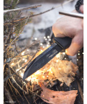 Švédský nůž velmi vysoké kvality s typickou skandinávskou čepelí. Jeden z nejrobustnějších nožů z produkce Mora je určený pro přežití v divočině a jejímu porozumění, ale i pro pohodlný pobyt v přírodě. Nůž je optimálně adaptovaný na procvičování dovedností při přežití, jako je rozdělání ohně, stopování, lov a rybolov nebo vybudování přístřeší. Čepel je vyrobena z německé uhlíkové oceli, která déle drží ostrost, a kalená na HRC 57,5. Ostří je potažené černou vrstvou, která chrání proti korozi. Horní část čepele lze použít jako ocílku spolu s magnéziovým podpalovačem pro rozdělání ohně, hrana čepele je speciálně pro tento účel naostřena. Solidní, masivní trn poskytuje maximální odolnost proti nárazu. Ergonomicky tvarovaná rukojeť s vroubky je vyrobená z odolného plastu černé barvy. Rukojeť je potažena vrstvou měkké přilnavé pryže, odolné proti skluzu. Záštita o délce 3,5 cm zabraňuje sklouznutí ruky a poranění prstů. Robustní plastové pouzdro černé barvy je doplněné o diamantový ostřič a úchyty pro připevnění škrtadla. Opora pro palec pro snadnější vytažení nože. Pouzdro je snadno omyvatelné, otvor ve špičce pouzdra usnadňuje odtok. Klip na opasek, který je možné zaměnit za plastový úchyt. Magnéziový podpalovač je spolehlivým prostředkem pro rozdělání ohně za každého počasí, je vodovzdorný, lze jej použít ve vlhku, chladu i sněhu. Pomocí ocílky se odstraní povrchový nátěr z podpalovače. Jako ocílka se používá vrchní hrana čepele. Plynulým rychlým pohybem se přejíždí ocílkou po celé délce tyčinky nad odřezky z podpalovače. Vzniklé jiskry snadno zapálí předem připravený troud, jako je suché jehličí, listí nebo suchá tráva. Trvanlivost podpalovače je 7000 škrtnutí, teplota jiskry 3000°C. Vzhledem k silné jiskře je možné světlo podpalovače použít jako nouzový signál. UPOZORNĚNÍ Uhlíková ocel je na rozdíl od nerezové oceli náchylná ke korozi, pokud není správně udržována. Péče o nůž z uhlíkové oceli je poměrně snadná a zabere minimum času. Nenechávejte nůž mokrý nebo vlhký, protože to může vést ke vzniku rezavých skvrn. Po každém použití, zejména při řezání kyselých předmětů, je nutné nůž důkladně omýt teplou vodou a okamžitě osušit, nejlépe čistým hadříkem (špinavý hadřík může obsahovat prvky, které by mohly urychlit proces reznutí). Olejování nože z uhlíkové oceli jej také pomáhá chránit před korozí.
