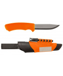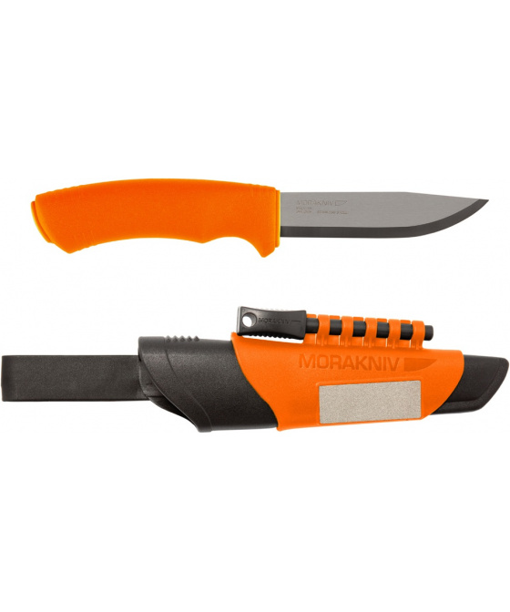 Švédský nůž velmi vysoké kvality s typickou skandinávskou čepelí. Jeden z nejrobustnějších nožů z produkce Mora je určený pro přežití v divočině a jejímu porozumění, ale i pro pohodlný pobyt v přírodě. Nůž je optimálně adaptovaný na procvičování dovedností při přežití, jako je rozdělání ohně, stopování, lov a rybolov nebo vybudování přístřeší. Čepel je vyrobena ze švédské nerezové oceli válcované za studena a kalené na HRC 56,5. Ostří je odolnější proti opotřebení. Horní část čepele lze použít jako ocílku spolu s magnéziovým podpalovačem pro rozdělání ohně, hrana čepele je speciálně pro tento účel naostřena. Solidní, masivní trn poskytuje maximální odolnost proti nárazu. Ergonomicky tvarovaná rukojeť s vroubky je vyrobená z odolného plastu oranžové barvy. Rukojeť je potažena vrstvou měkké přilnavé pryže, odolné proti skluzu. Záštita o délce 3,5 cm zabraňuje sklouznutí ruky a poranění prstů. Robustní plastové pouzdro oranžovočerné barvy je doplněné o diamantový ostřič a úchyty pro připevnění škrtadla. Opora pro palec pro snadnější vytažení nože. Pouzdro je snadno omyvatelné, otvor ve špičce pouzdra usnadňuje odtok. Klip na opasek, který je možné zaměnit za plastový úchyt. Magnéziový podpalovač je spolehlivým prostředkem pro rozdělání ohně za každého počasí, je vodovzdorný, lze jej použít ve vlhku, chladu i sněhu. Pomocí ocílky se odstraní povrchový nátěr z podpalovače. Jako ocílka se používá vrchní hrana čepele. Plynulým rychlým pohybem se přejíždí ocílkou po celé délce tyčinky nad odřezky z podpalovače. Vzniklé jiskry snadno zapálí předem připravený troud, jako je suché jehličí, listí nebo suchá tráva. Trvanlivost podpalovače je 7000 škrtnutí, teplota jiskry 3000°C. Vzhledem k silné jiskře je možné světlo podpalovače použít jako nouzový signál.