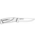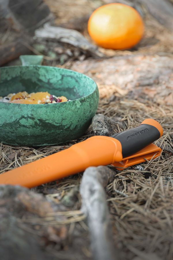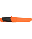 švédský nůž velmi vysoké kvality s typickou skandinávskou čepelí s třívrstvým povlakem všestranný výkonný nástroj pro lovce, zálesáky a všechny outdoorové nadšence vyznávající svobodu pohybu ve volné přírodě nůž je možné využít při batoningu technice řezání nebo štípání dřeva pomocí úderů do hřbetu nože, splňuje maximální požadavky na pevnost úhel ostří 27° nabízí dostatečnou ostrost a odolnost čepel je vyrobena z uhlíkové oceli, která déle drží ostrost, a kalená na HRC 57,5 tvarovaná rukojeť s prolisem je vyrobená z odolného plastu černé barvy rukojeť je potažena vrstvou měkké přilnavé pryže, odolné proti skluzu záštita v oranžové barvě o délce 3 cm zabraňuje sklouznutí ruky a poranění prstů plastové pouzdro oranžové barvy opora pro palec pro snadnější vytažení nože pouzdro je snadno omyvatelné, otvor ve špičce pouzdra usnadňuje odtok plastový klip na opasek