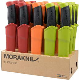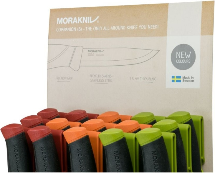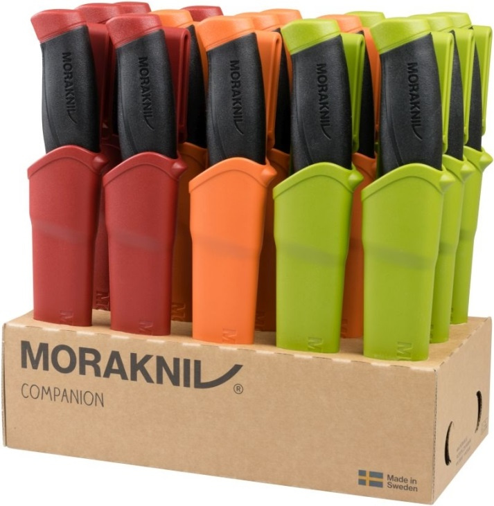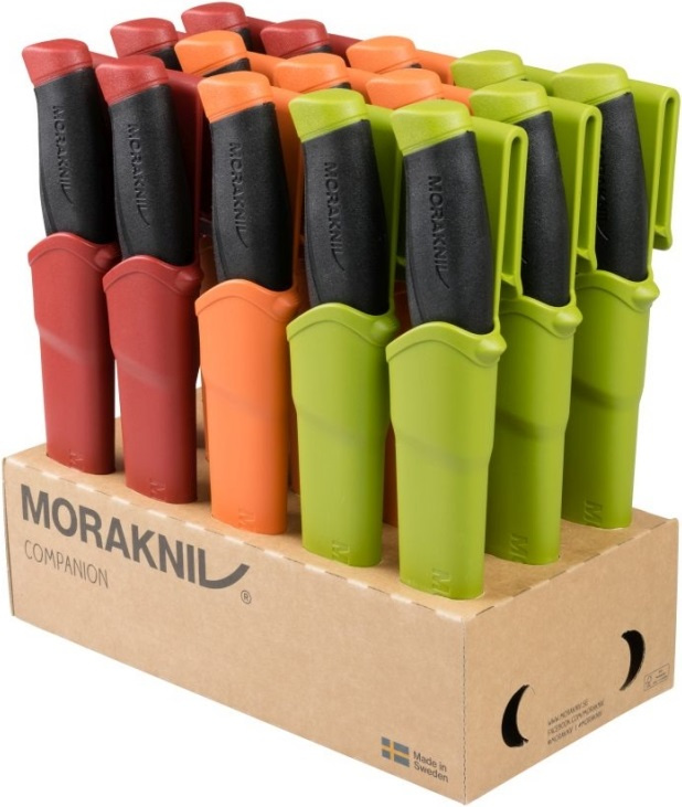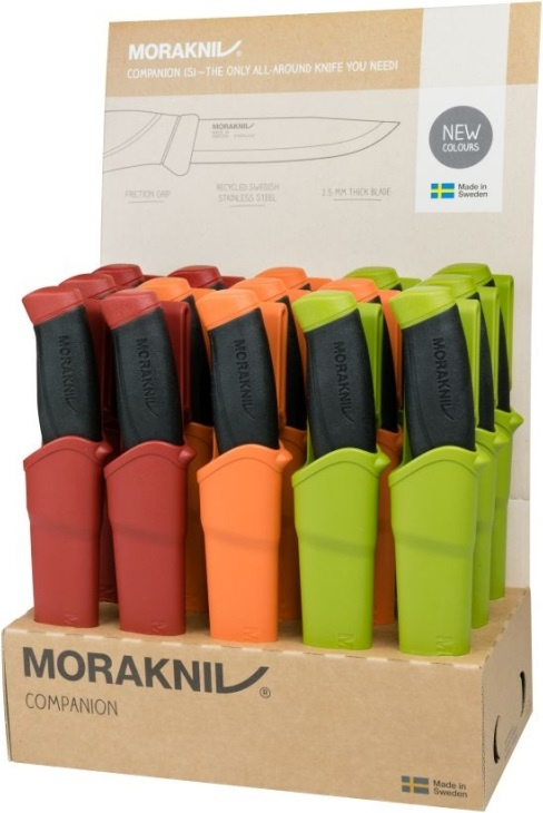 Sada 15 švédských nožů velmi vysoké kvality s dlouhou životností. Tyto všestranné nože jsou určené pro stejnou cílovou skupinu jako model Bushcraft a jsou spojené s uměním přežití a pobytem v přírodě, ale velké uplatnění naleznou i jako pracovní nože. Tvar a provedení slouží efektivně ke snížení únavy a rizika poranění při opakujících se pohybech při používání nožů. Čepele jsou vyrobené z nerezové oceli 12C27 válcované za studena a kalené na HRC 57-58 s ostřím odolnějším proti opotřebení. Tvarované rukojeti s prolisem jsou vyrobené z odolného plastu potaženého vrstvou měkké přilnavé termoplastické pryže, odolné proti skluzu. Záštity o délce 3 cm zabraňují sklouznutí ruky a poranění prstů. Polymerová plastová pouzdra orientovaná doprava. Opory pro palec pro snadnější vytažení nože. Pouzdra jsou snadno omyvatelné, otvory ve špičce pouzder usnadňují odtok. Plastové klipy na opasek. Sada obsahuje: 5x model 13166 Companion (S) Desert 5x model 11827 Companion (S) Military Green 5x model 14141 Companion (S) Black