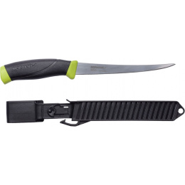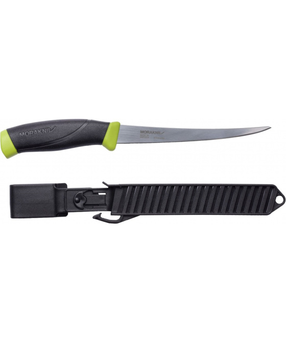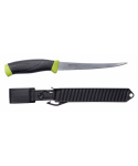 Dlouhý tenký filetovací nůž prvotřídní kvality pro použití v pravé i levé ruce. Rovná pružná čepel s částečně zaobleným hrotem je vyrobena ze švédské nerezové oceli válcované za studena a kalené na HRC 56,5. Ostří je odolnější proti opotřebení. Tvarovaná rukojeť s prolisem je vyrobená z odolného plastu černé barvy. Rukojeť je potažena vrstvou měkké přilnavé pryže, odolné proti skluzu. Záštita v zelené barvě zabraňuje sklouznutí ruky a poranění prstů. Polymerové pouzdro s otvory orientované doprava je velmi snadno omyvatelné a usnadňuje odtok. Klip na opasek a poutko na opasek, které jsou zaměnitelné. Otvor pro možnost zavěšení. Baleno v blistru.