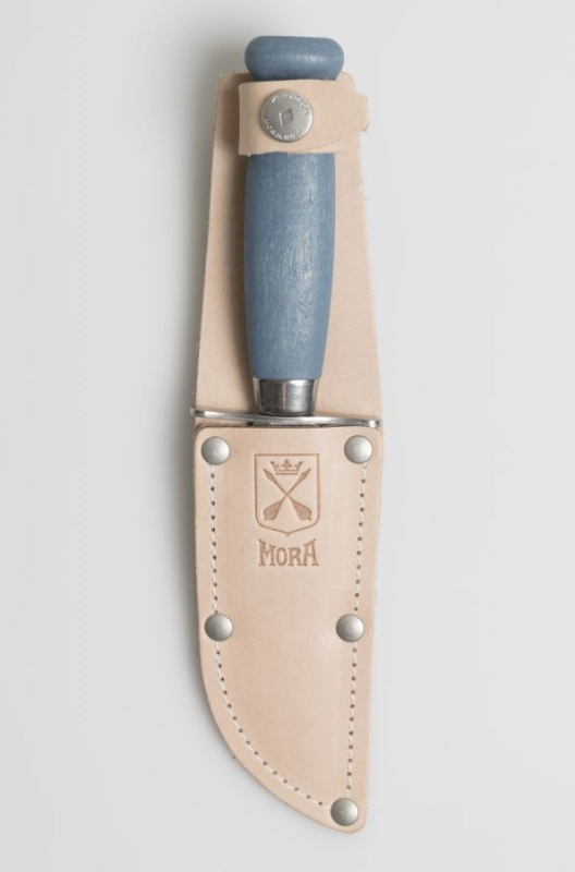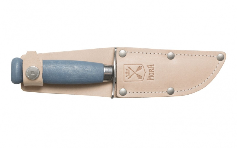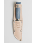 švédský nůž pro malé dobrodruhy v přírodní modré barvě s čepelí 86mm ze švédské nerezové oceli s dvojitým chráničem prstů, ostrou špičkou, soudkovitou rukojetí dobře padnoucí do ruky a koženým pouzdrem s vyražený dalekarským erbemVíce