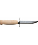 Švédský nůž Morakniv Scout navržený pro malé dobrodruhy v barvách inspirovaných přírodou a optimalizovaný pro bezpečné použití. Současný klasický tvar nože vychází z modelu z roku 1930, ale historie výroby sahá až do roku 1891 - v regionu Mora se podobné nože vyráběly již v 16. století. Aby nůž vydržel po další generace, je čepel vyrobena ze švédské nerezové oceli válcované za studena s tvrdostí HRC 56,5. Ostří je odolnější proti opotřebení a svou ostrost si zachovává po dlouhou dobu. Dvojitý chránič prstů z nerezové oceli o délce 4.8 mm je důležitým bezpečnostním prvkem a zabraňuje sklouznutí ruky a poranění. Špička nože je zaoblená pro maximální bezpečí. Mořená rukojeť ze švédského březového dřeva má soudkovitý tvar, který pohodlně padne do malé ruky. Díky menší geometrii rukojeti se nůž dobře drží. Kožené pouzdro v přírodní barvě s nýtováním je vyrobené ze švédské usně činěné zeleninou. Pečlivě chrání malého uživatele i ostří nože před poškozením. Díky poutku ho snadno připevníte na opasek a pro bezpečnost je vybaveno jednoduchým klasickým zámkem na druk, který zajišťuje nůž v pouzdře. Vyražený dalekarský erb na pouzdru je dobře uchovaným detailem z dob minulých.