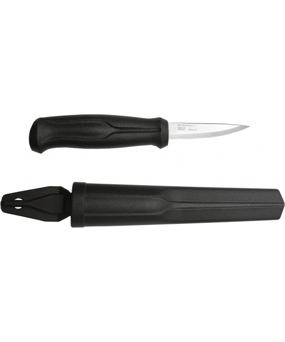 dvoubřitý řezbářský nůž ze světoznámé švédské produkce v oblasti Mora používaný při výrobě švédského národního symbolu koně Dala čepel je vyrobena ze švédské nerezové oceli válcované za studena a kalené na HRC 56,5 ostří je odolnější proti opotřebení vrchní hrana čepele není leštěna tvarovaná rukojeť s prolisem je vyrobená z odolného plastu černé barvy a je odolná proti skluzu plastové pouzdro černé barvy pouzdro je snadno omyvatelné, otvor ve špičce pouzdra usnadňuje odtok plastové poutko na opasek
