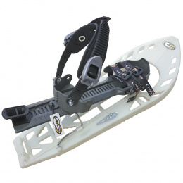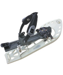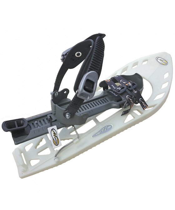 Fluorescenční model sněžnic se stoupací patkou, ráčnovým vázáním a nosností do 64 kg.