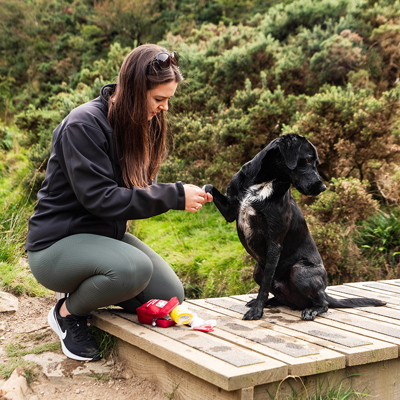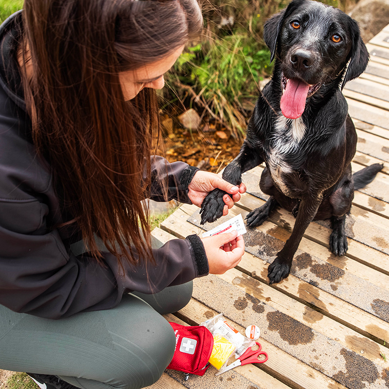 Lékárnička obsahuje 20 základních zdravotnických pomůcek, jako jsou obvazy, krytí a pinzeta, takže budete vždy připraveni poskytnout svému psovi rychlou první pomoc.