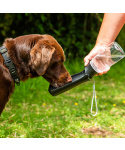 Folding Dog Water Bottle je cestovní 550 ml láhev na vodu s integrovaným sklopným pítkem. Výhodou je minimální rozměr, rychlost podání tekutin a samotné omývání. Vodu lze jednoduše dávkovat pomocí tlačítka.