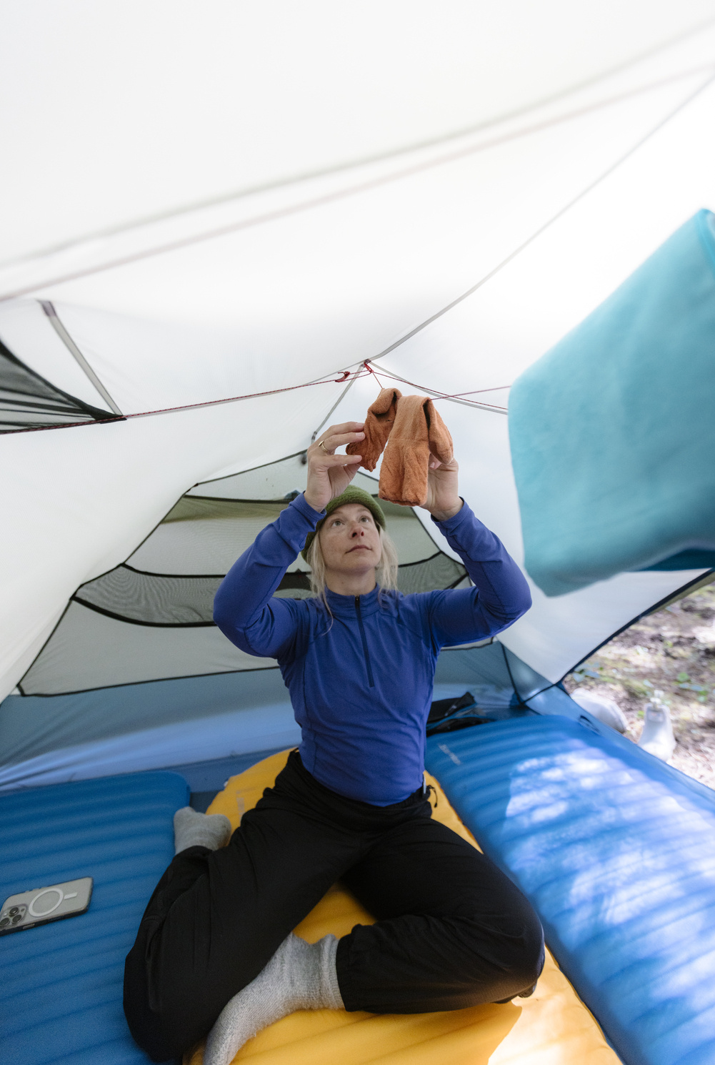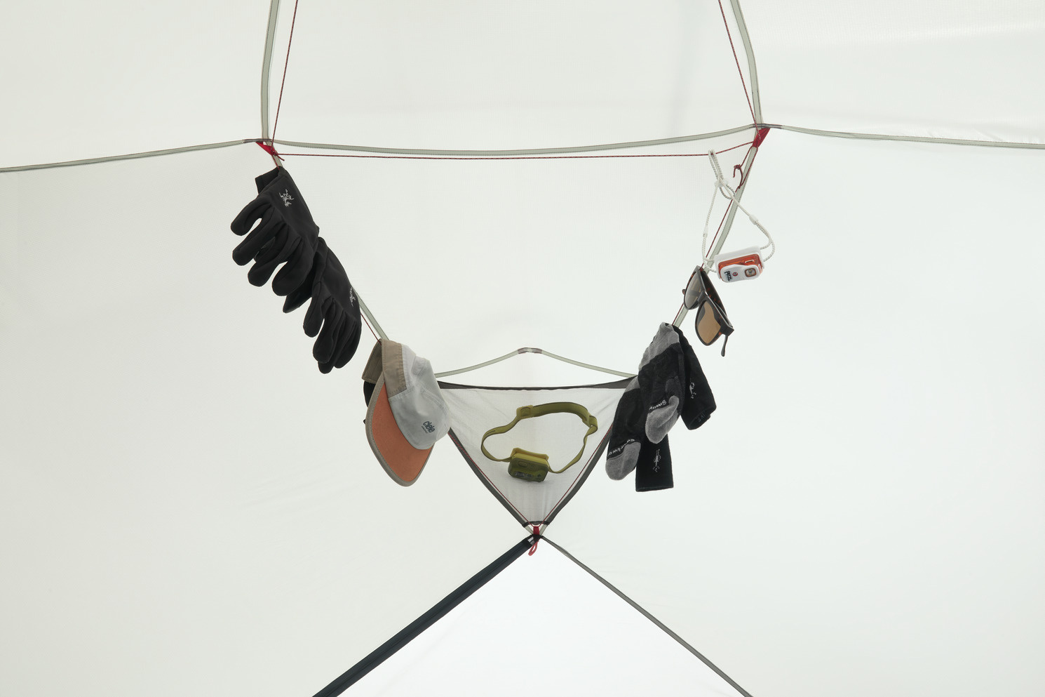 Velká stropní kapsa pro uložení věcí a integrovaná šňůra na sušení mokrého oblečení a výbavy.