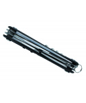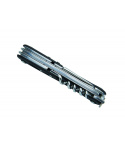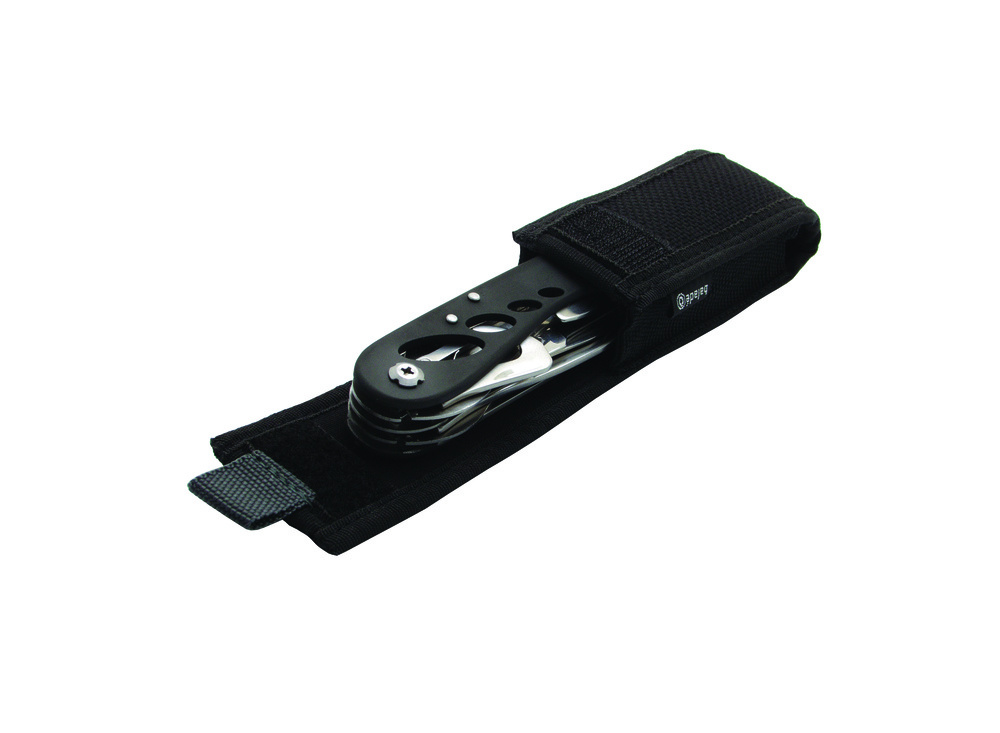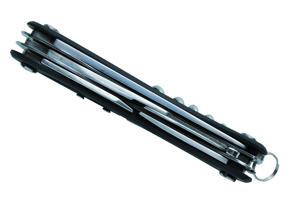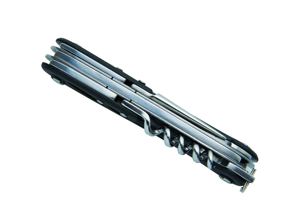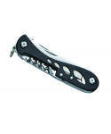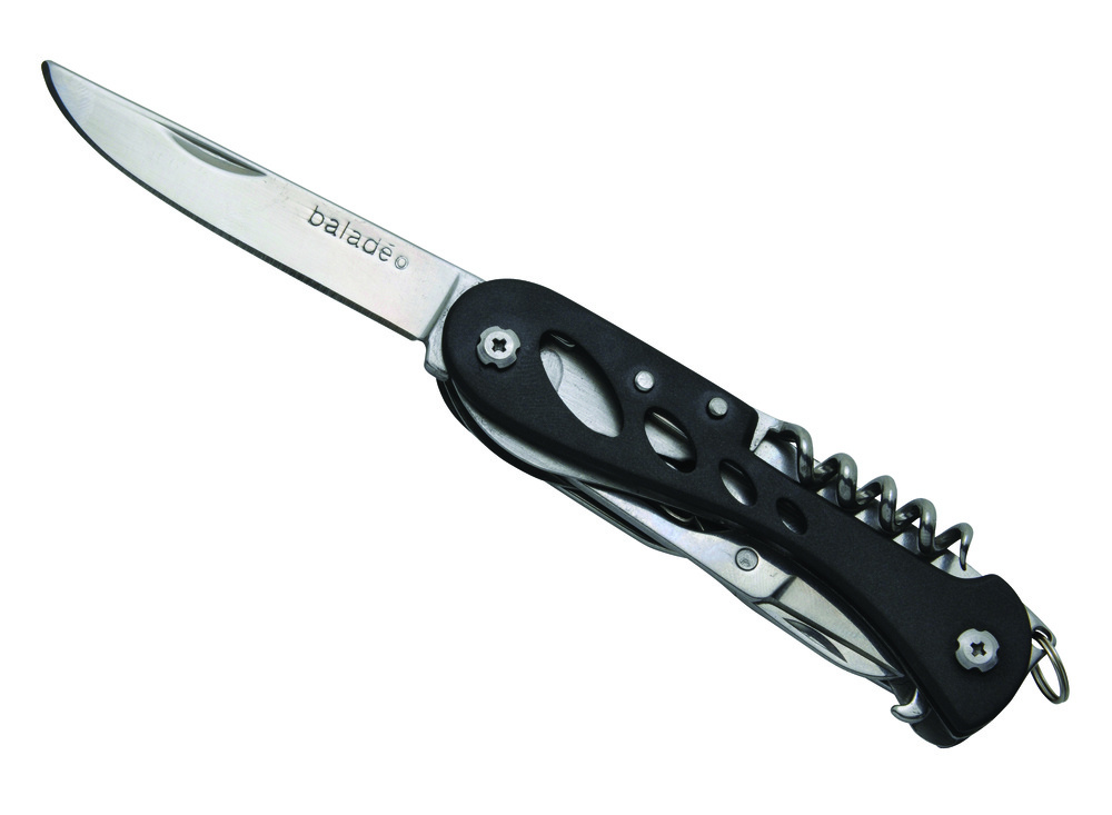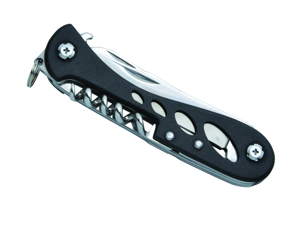 Multifunkční nůž s 9-ti funkcemi: nůž s pojistkou; otvírák lahví, nůžky, otvírák na konzervy s pojistkou, 5mm a 2mm plochý šroubovák, vývrtka, děrovačka,kroužek.