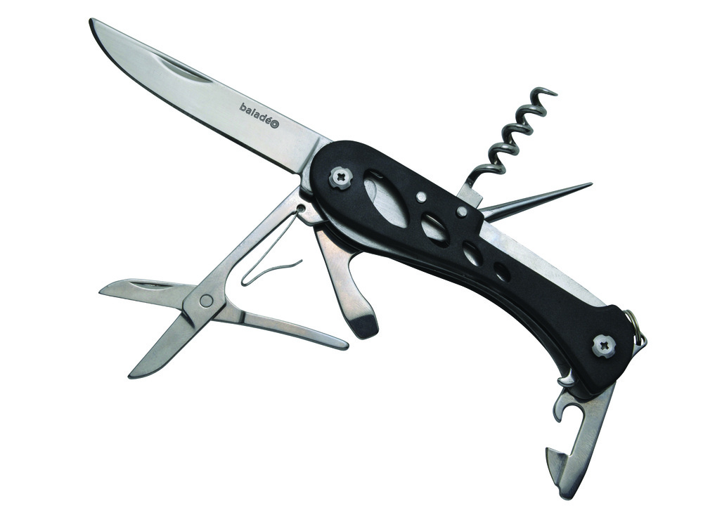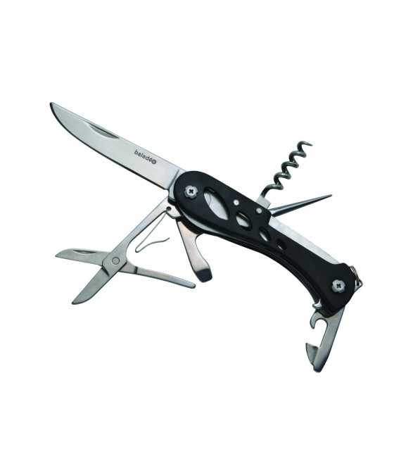 Multifunkční nůž s 9-ti funkcemi: nůž s pojistkou; otvírák lahví, nůžky, otvírák na konzervy s pojis