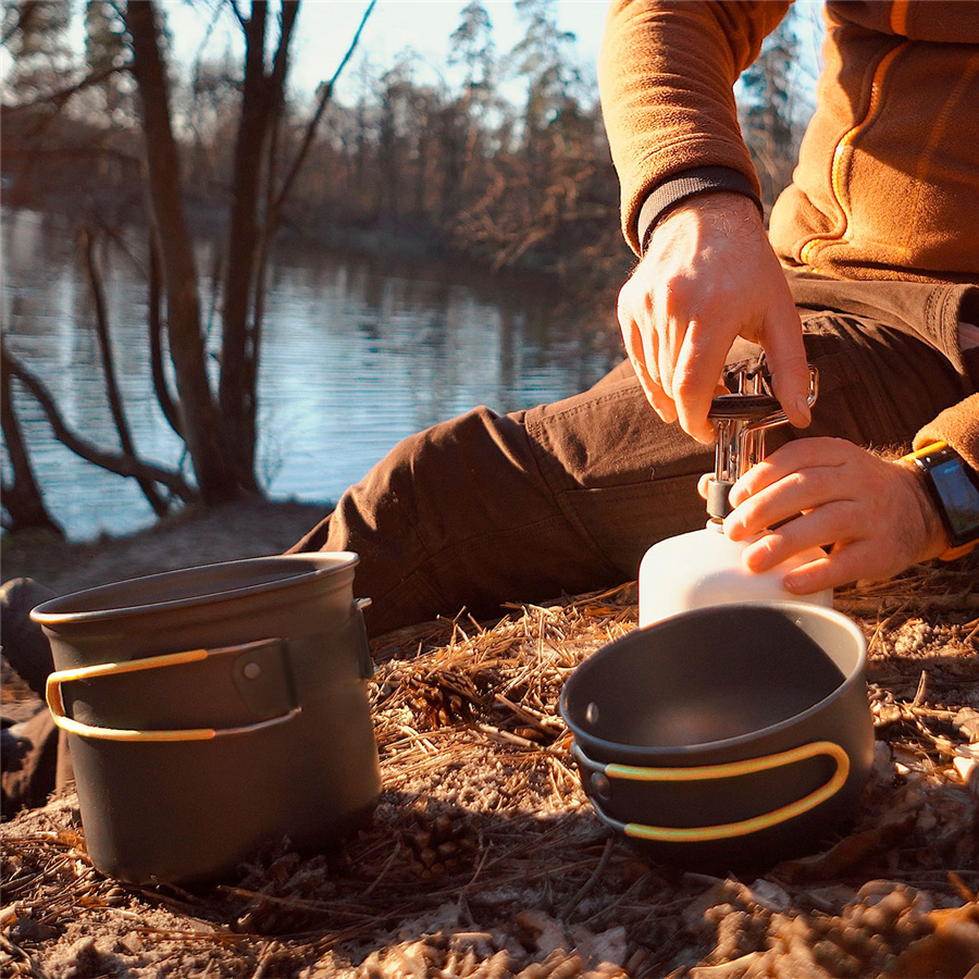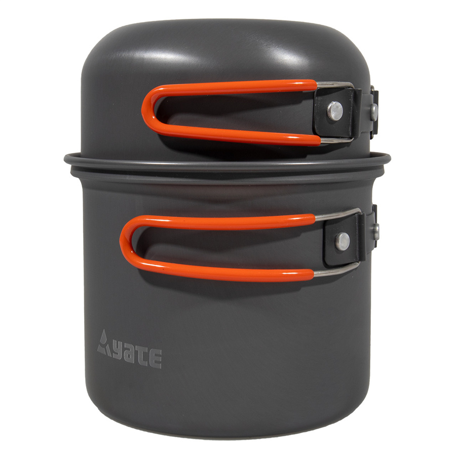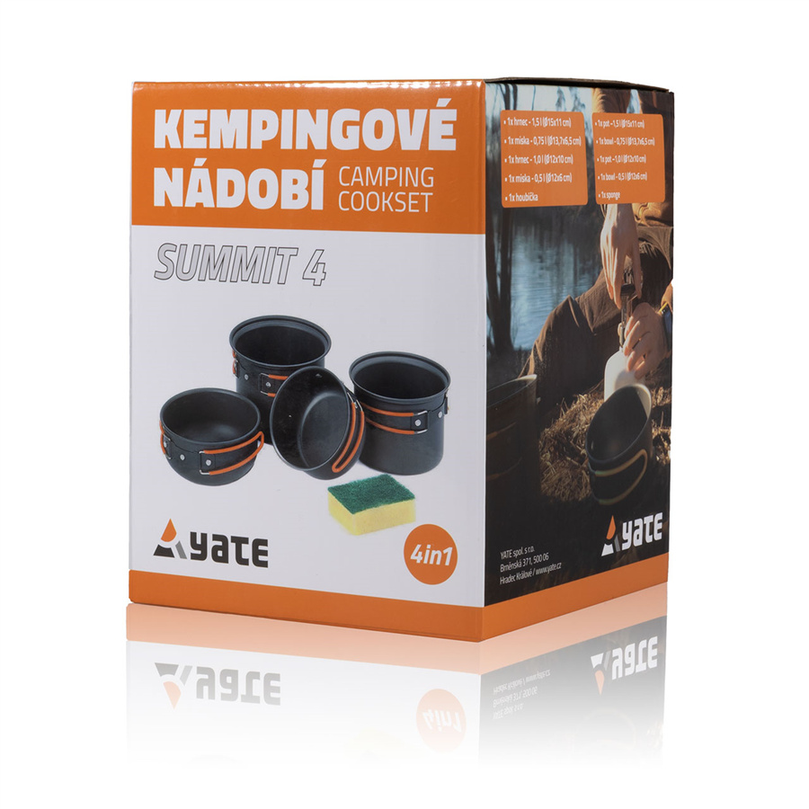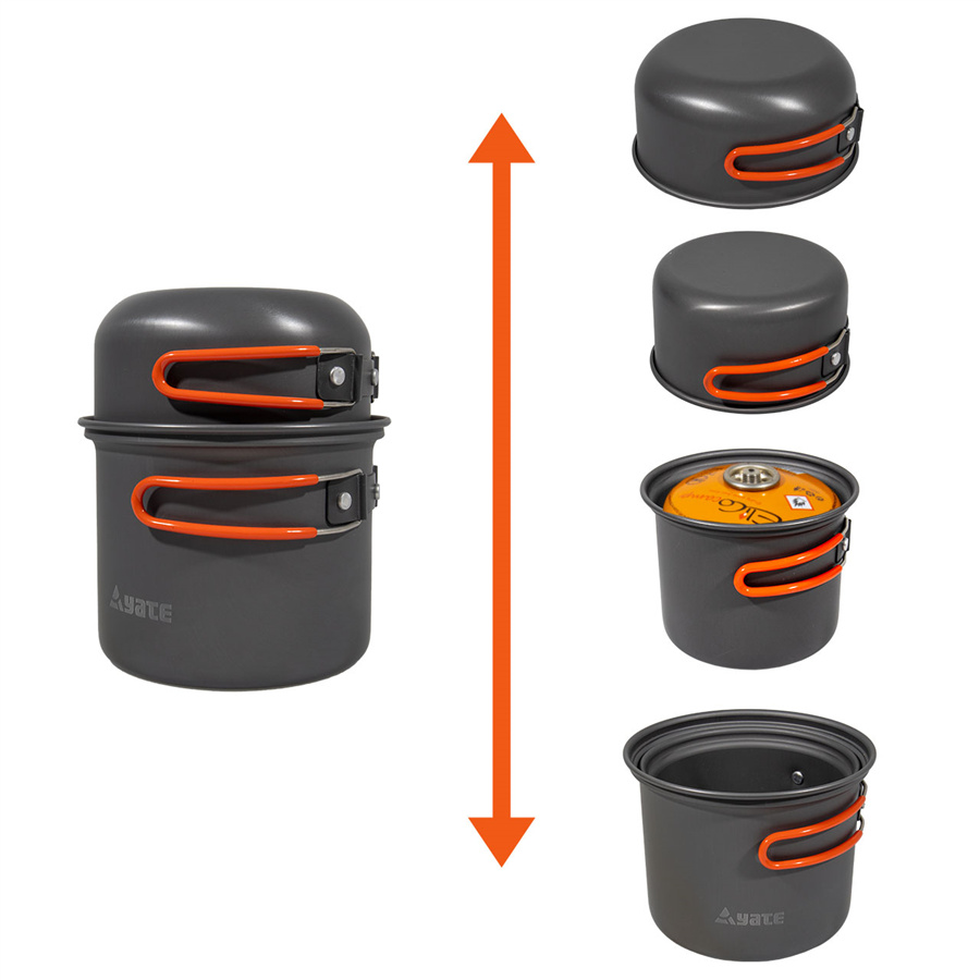Sada nádobí pro 2-3 osoby z eloxovaného potravinářského hliníku je opatřena vrstvou odolnou proti oděru. Držadla jsou chráněna silikonem proti popálení a jsou příjemná do ruky. Dodáváno včetně přepravního obalu.