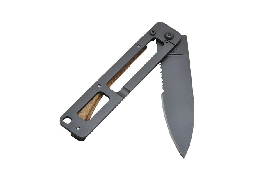 Odlehčený kapesní nůž Baladeo Papagayo s čepelí dlouhou 7,5 cm, polovina čepele je ozubená, čepel je nerezová s titanovou úpravou, rukojeťí z dřeva zebrano. Nůž je optřen 80 cm paracordu.