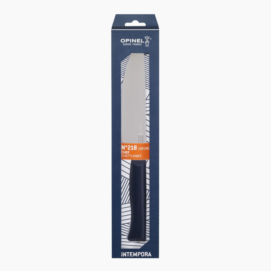 Kuchařský nůž Opinel Intempora je vhodný pro práci s masem i zeleninou. Oceníte ho při krájení, plátkování i sekání, jelikož umožňuje kolíbkový pohyb. Nůž má stabilní, 200 mm dlouhou a 3 mm silnou čepel vyrobenou ze speciální modifikované oceli 12C27 M (Sandvik Mod) s tvrdostí 57 HRC Rockwellovy stupnice. Úhel ostří umožňuje bezpečný úchop. Rukojeť v kouřově modré barvě je ergonomicky tvarovaná a vyrobená z vysoce odolného polymeru. Lze mýt v myčce nádobí, ale doporučeno je především ruční mytí.