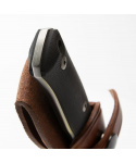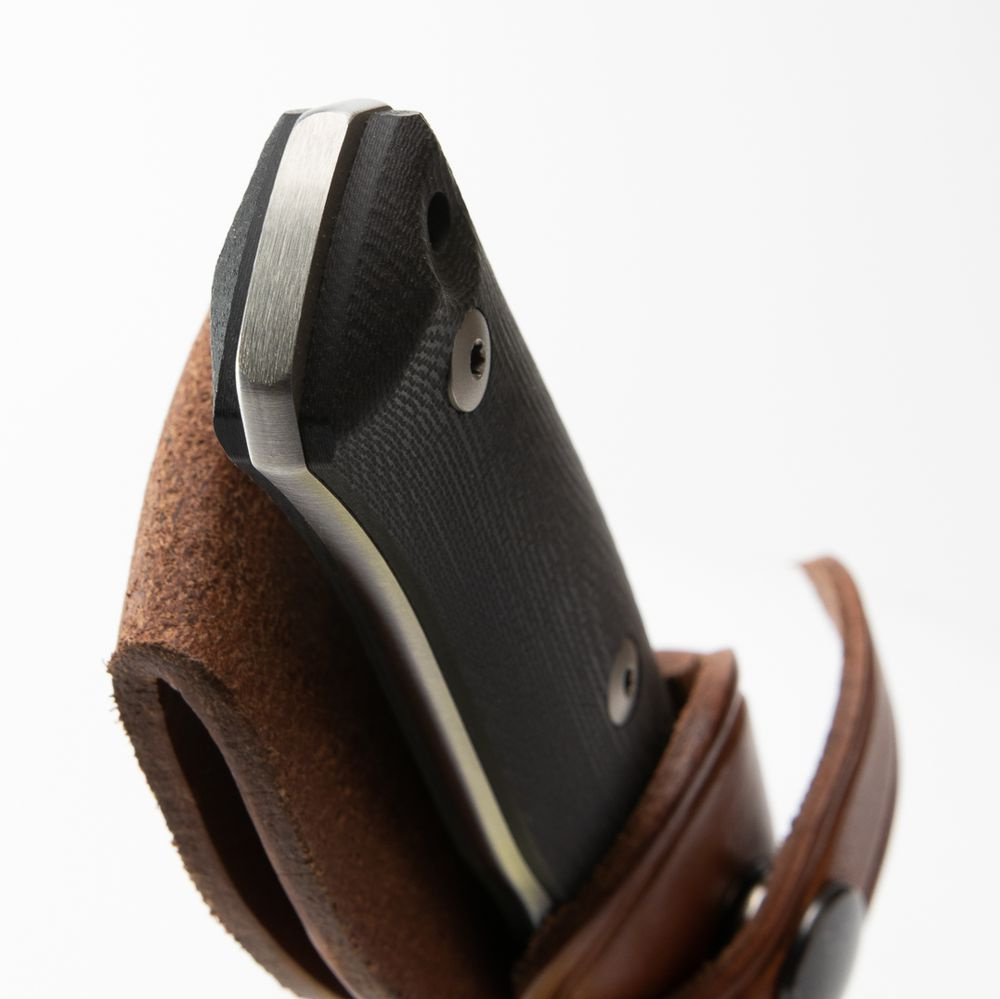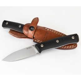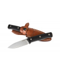 Nůž typu bushcraft s pevnou čepelí z ocele Sleipner, uložený do masivního koženého pouzdra.