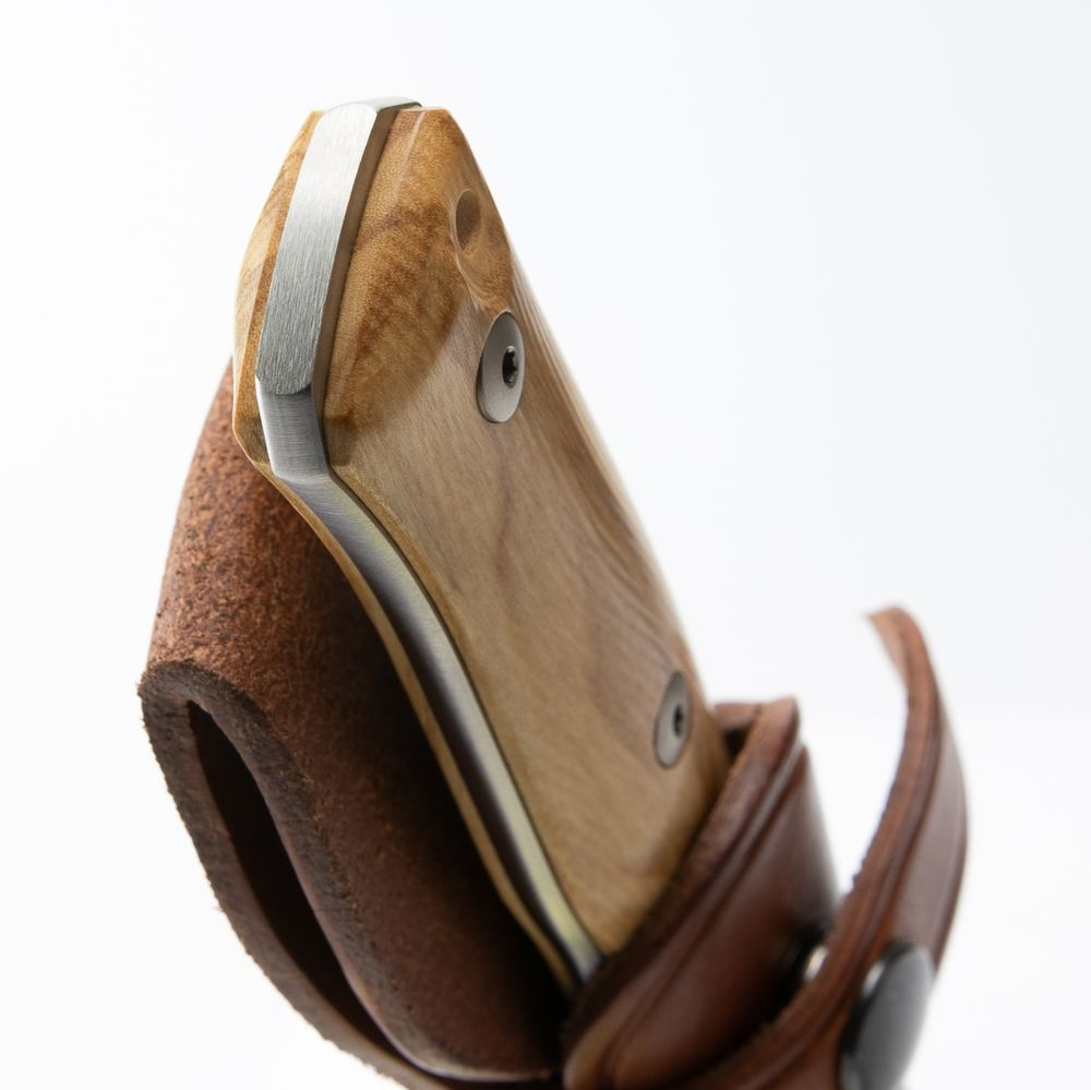 Nůž typu bushcraft s pevnou čepelí z ocele Sleipner, uložený do masivního koženého pouzdra.
