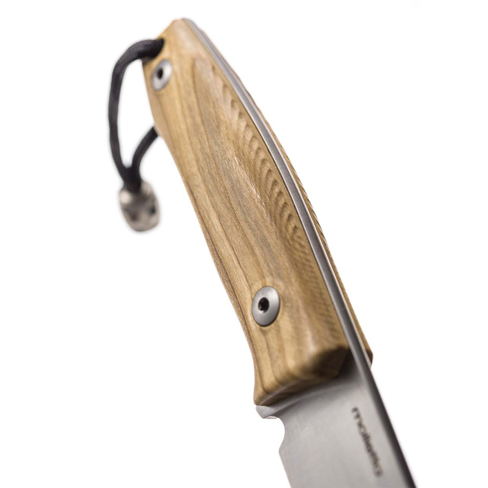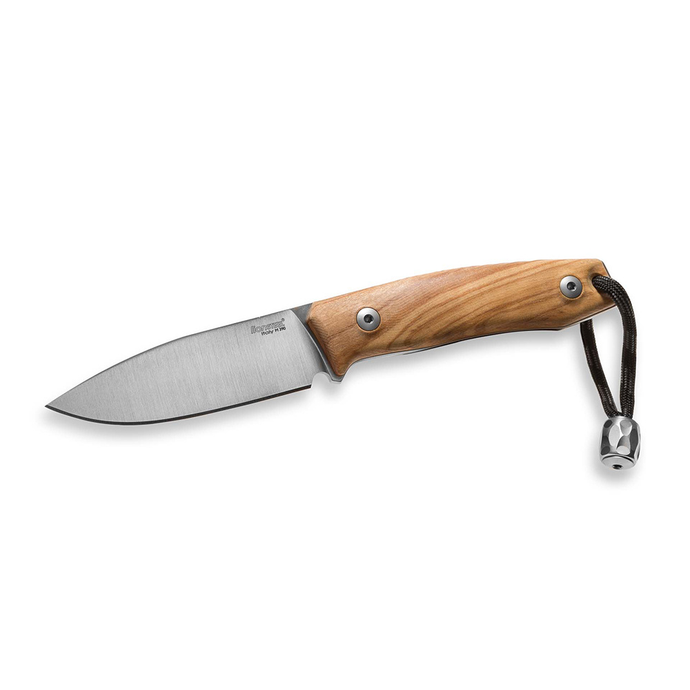 Velmi praktická a univerzální velikost nože s pevnou čepelí, verze s rukojetí z olivového dřeva, dodáváno včetně pouzdra.