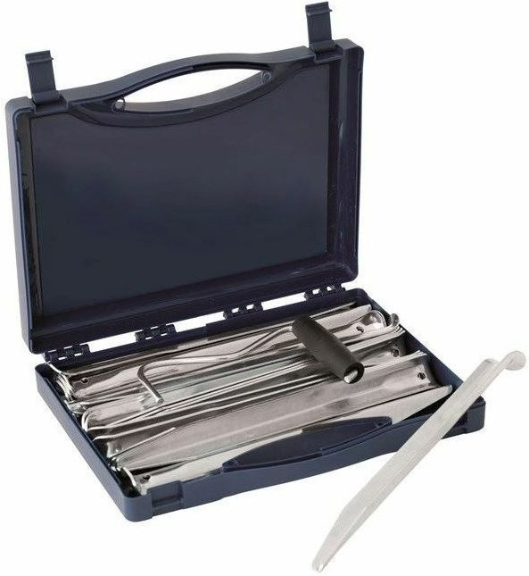 sada dvaceti náhradních ocelových stanových kolíků o délce 24 cm "U" profil uloženo v plastovém opětovně použitelném transportním boxu součástí balení je háček na vytahování kolíků