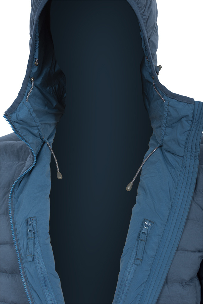 - Unikátní dvouvrstvá konstrukce látky s tkanými spoji nahrazujícími švy jednotlivých komor eliminuje únik teplého vzduchu skrze švy a v kombinaci s velmi výkonnou vodoodpudivou úpravou C6 DWR zvyšuje odolnost bundy proti vniknutí vlhkosti.