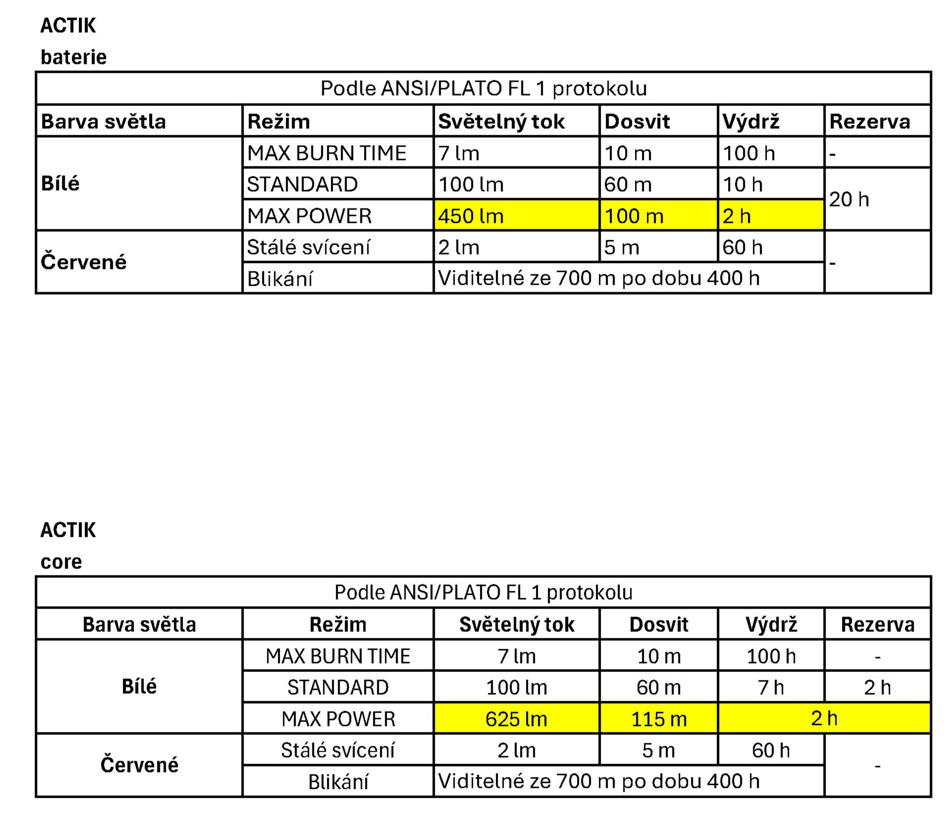 - ACTIK se dodává se třemi standardními bateriemi AAA/LR03 a funguje také na dobíjecí akumulátor CORE (není součástí balení), svítilna automaticky rozpozná typ zdroje a upravuje světelný výstup
