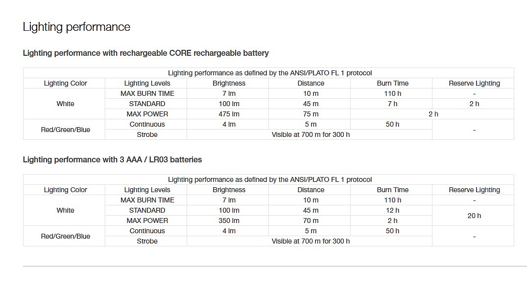 • Čelovka automaticky rozpozná zdroj energie a upravuje světelný tok; se standardními bateriemi má čelovka nižší světelný tok (350 lumenů v režimu MAX POWER) po delší dobu.