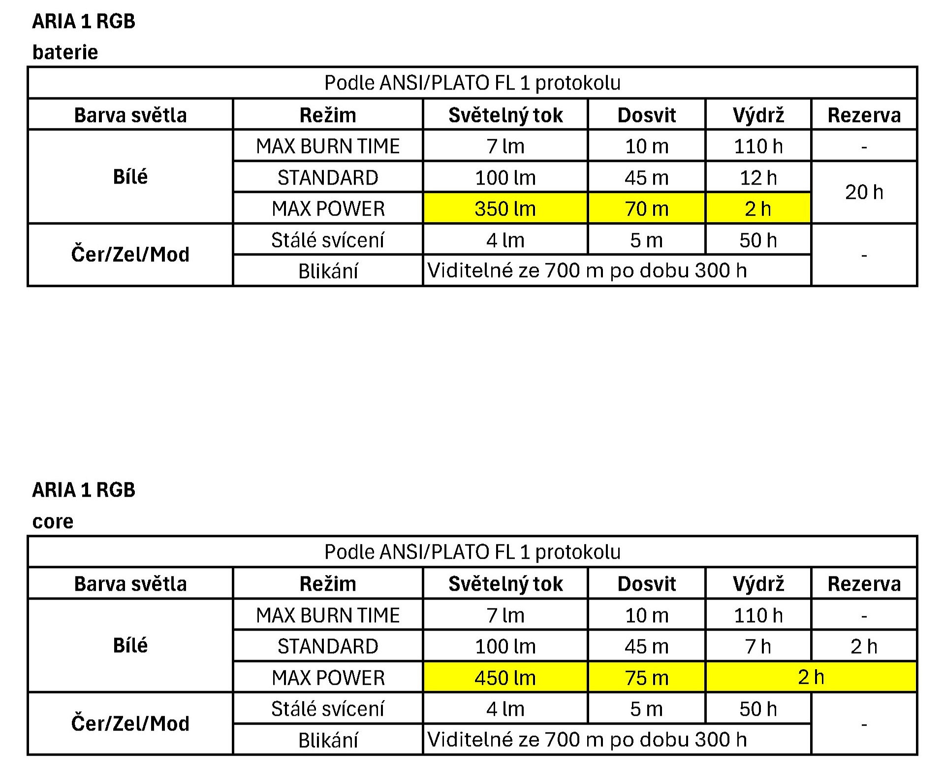 Svítilna ARIA 1R RGB (475 lm) byla navržena tak, aby splňovala časté a náročné potřeby jevištních techniků, údržbářů a řemeslníků. Je ultrakompaktní, odolná, vodotěsná a prachotěsná a je vhodná pro různé pracovní podmínky. Svítilna ARIA 1R RGB je dobíjecí a je dodávána s dobíjecím akumulátorem CORE. Díky technologii HYBRID CONCEPT je také kompatibilní se třemi standardními bateriemi. Snadno se používá a všechny funkce svítilny se ovládají jedním tlačítkem. Rovnoměrný široký kužel světla nabízí pohodlné vidění na blízko. Funkce tří barev světla červené/zelené/modré zachovává noční vidění a v případě potřeby poskytuje nenápadnost. Je praktická a lze ji nosit na hlavě, kolem krku a na různých typech přileb pomocí montážních adaptérů, které jsou k dispozici jako příslušenství. Barevné varianty, černá, kamufláž a dezert, se používá pro vojenské účely, lovce a rybáře.