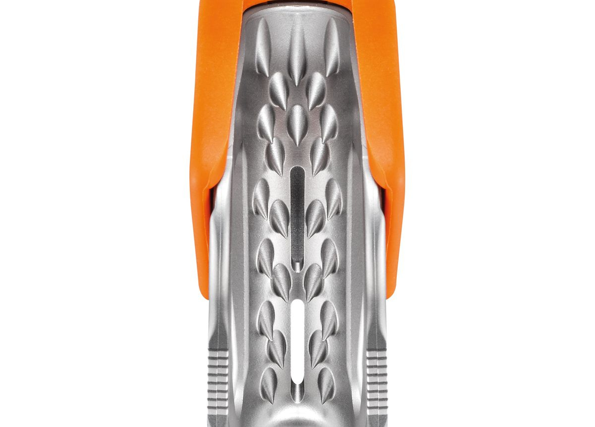 - Tělo z nerezové oceli opatřené hroty a samočistící otvory bezpečně blokují lano a to i v blátivých nebo ledových podmínkách