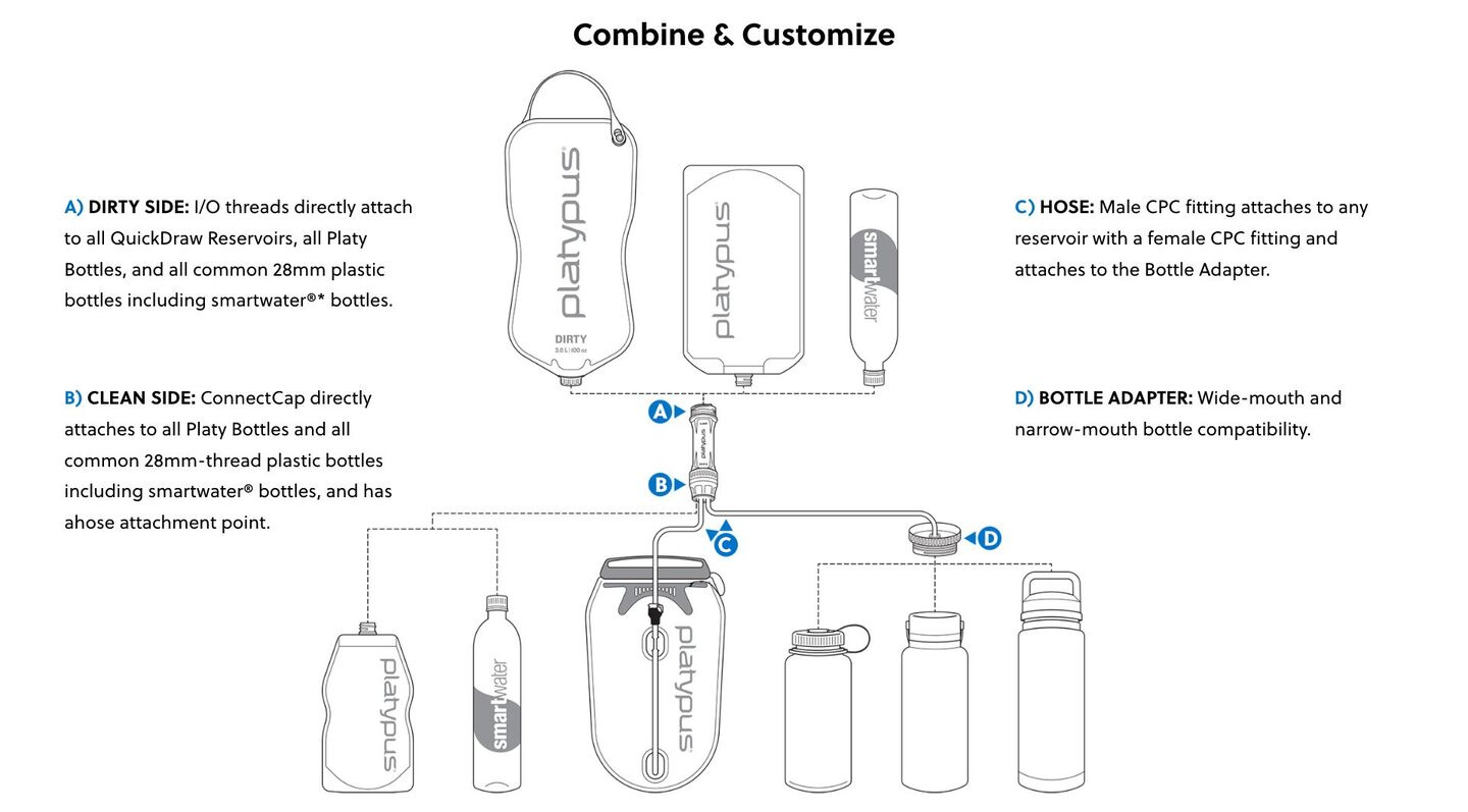 - Vyšší kompatibilita: pomocí uzávěru ConnectCap™ je možné snadno napojit na lahve Platy a běžné PET lahve o průměru hrdla 28 mm, konektor umožňuje přímé filtrování do vaků vybavených uzávěrem jako je BigZip™
