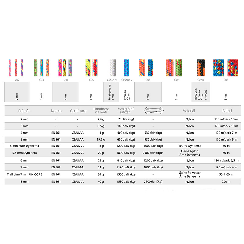 | 5,5mm Dyneema | EN 564 | CE/UIAA | 20 | 1800 | 2000 | Oplet nylon, jádro Dyneema | 50 |