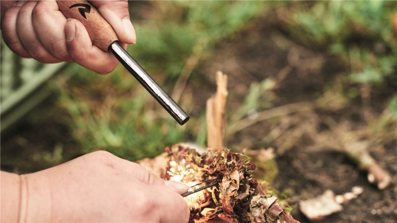 -pomocí přiložené ocílky, vrchní hrany nože či jiného vhodného kovového předmětu se naškrábejte drobné magnéziové piliny na vhodný troud, jako je suché jehličí, listí nebo suchá tráva