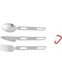 sada příborů z odolné nerezové oceli obsahující lžíci, vidličku a jídelní nůž materiál je extrémně trvanlivý a odolný proti poškrábání a vysokým teplotám nezachycuje pachy ani chutě příbor je upevněný na odnímatelné kovové karabince lze mýt v myčce nádobí