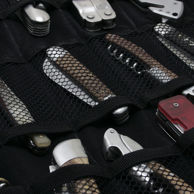 Látkové svinovací pouzdro pro bezpečný transport až 30 ks menších kapesních nožů.