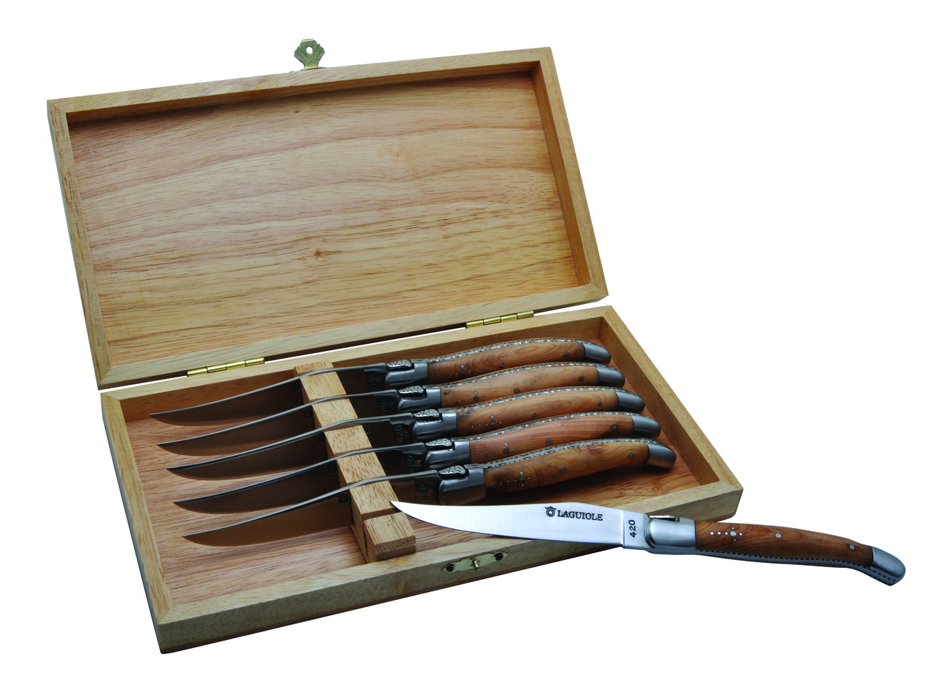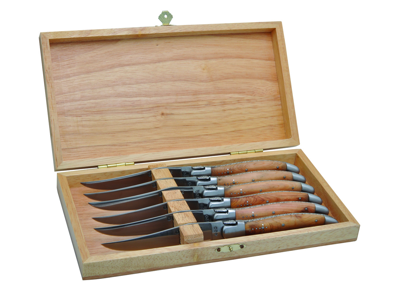 Sada 6ti nádherných Laquiole steakových nožů s eletantní rukojetí z jalovcového dřeva.