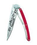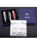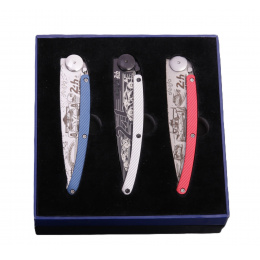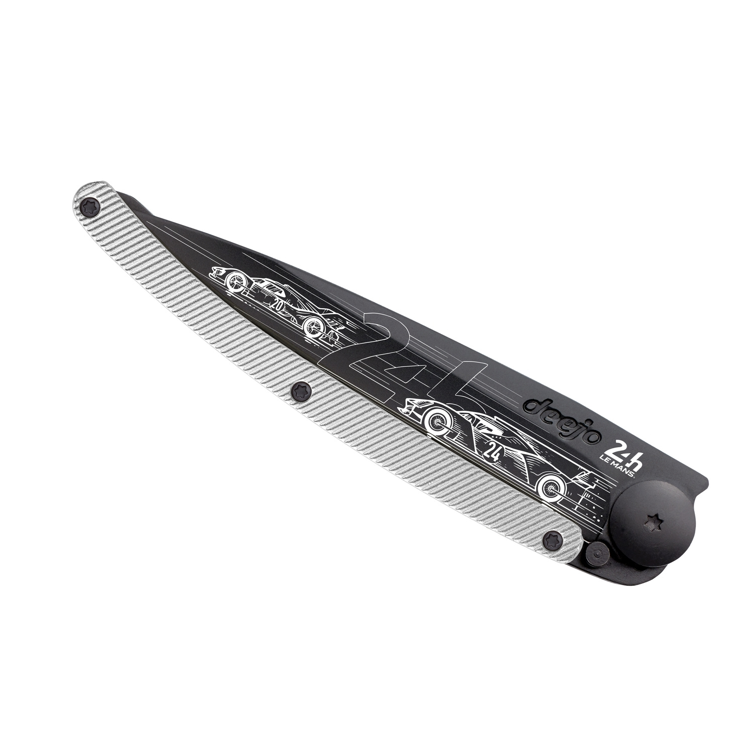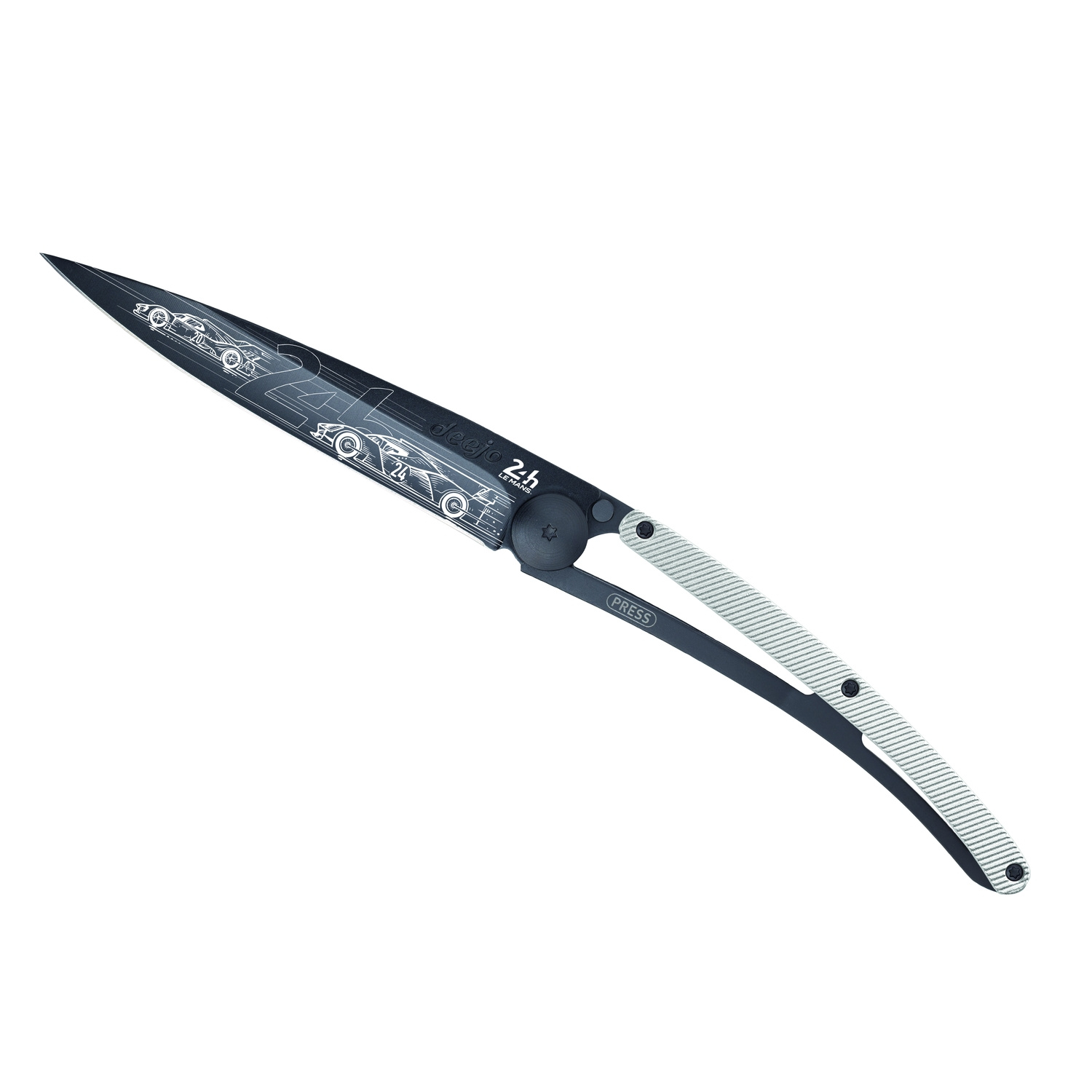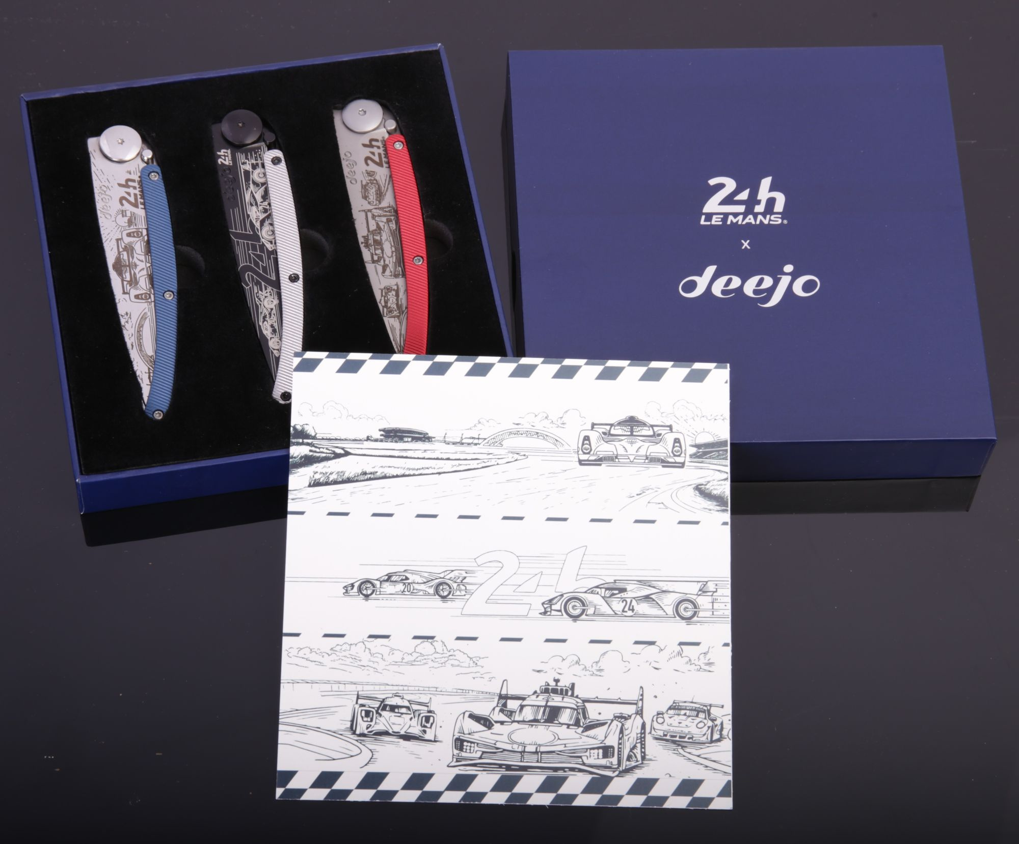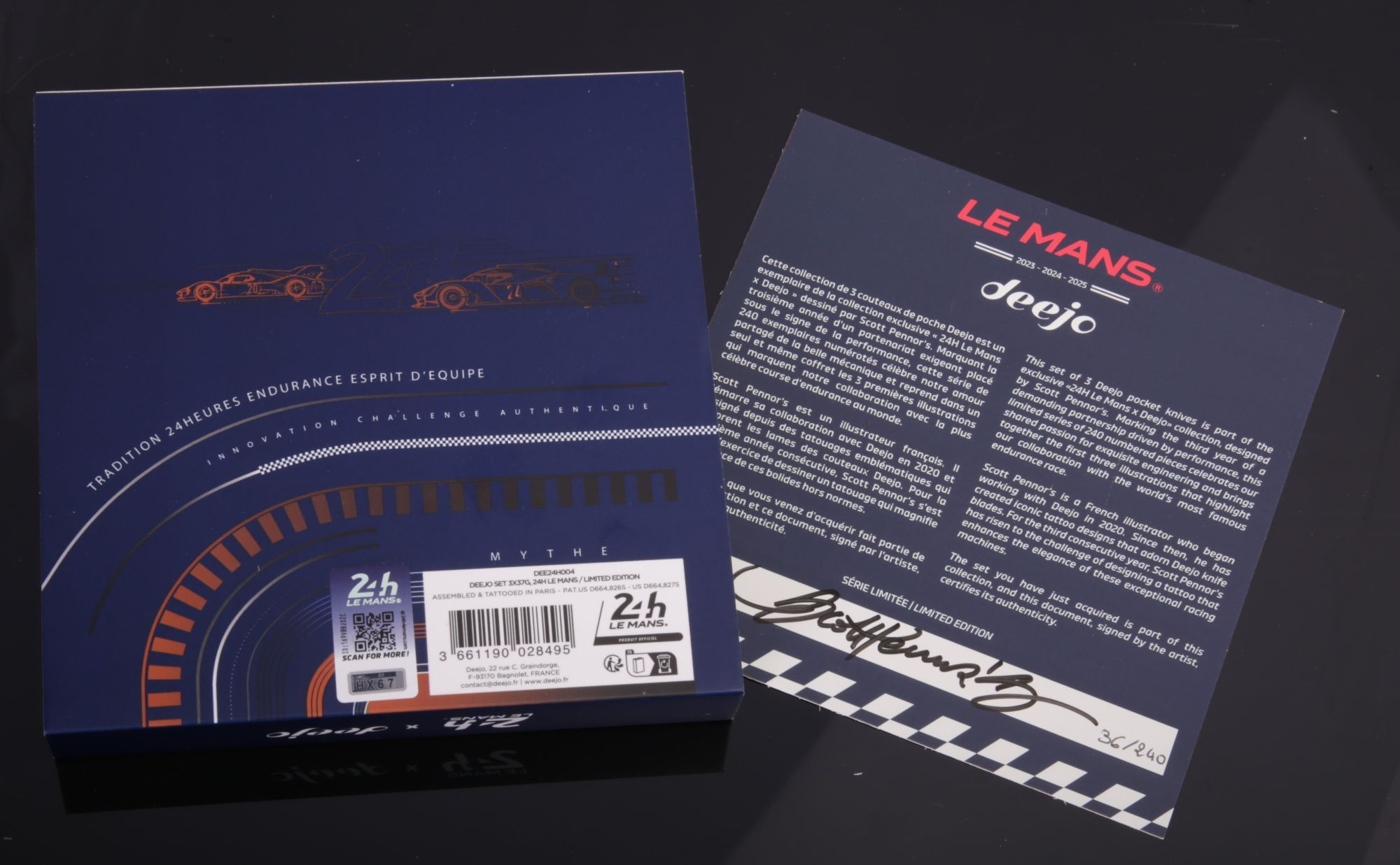 Sada 3 kusů stylových ultralehkých nožů Deejo ze sběratelské edice 2025 24H Le Mans s tetováním. Motivem je současná soutěž tří kagorií vozidel na jedné trati po dobu 24 hodin: vozidlo Hypercar, LMP2 a LMGT. Limitovaná a číslovaná edice 240 kusů. Dodáváno s certifikátem pravosti.