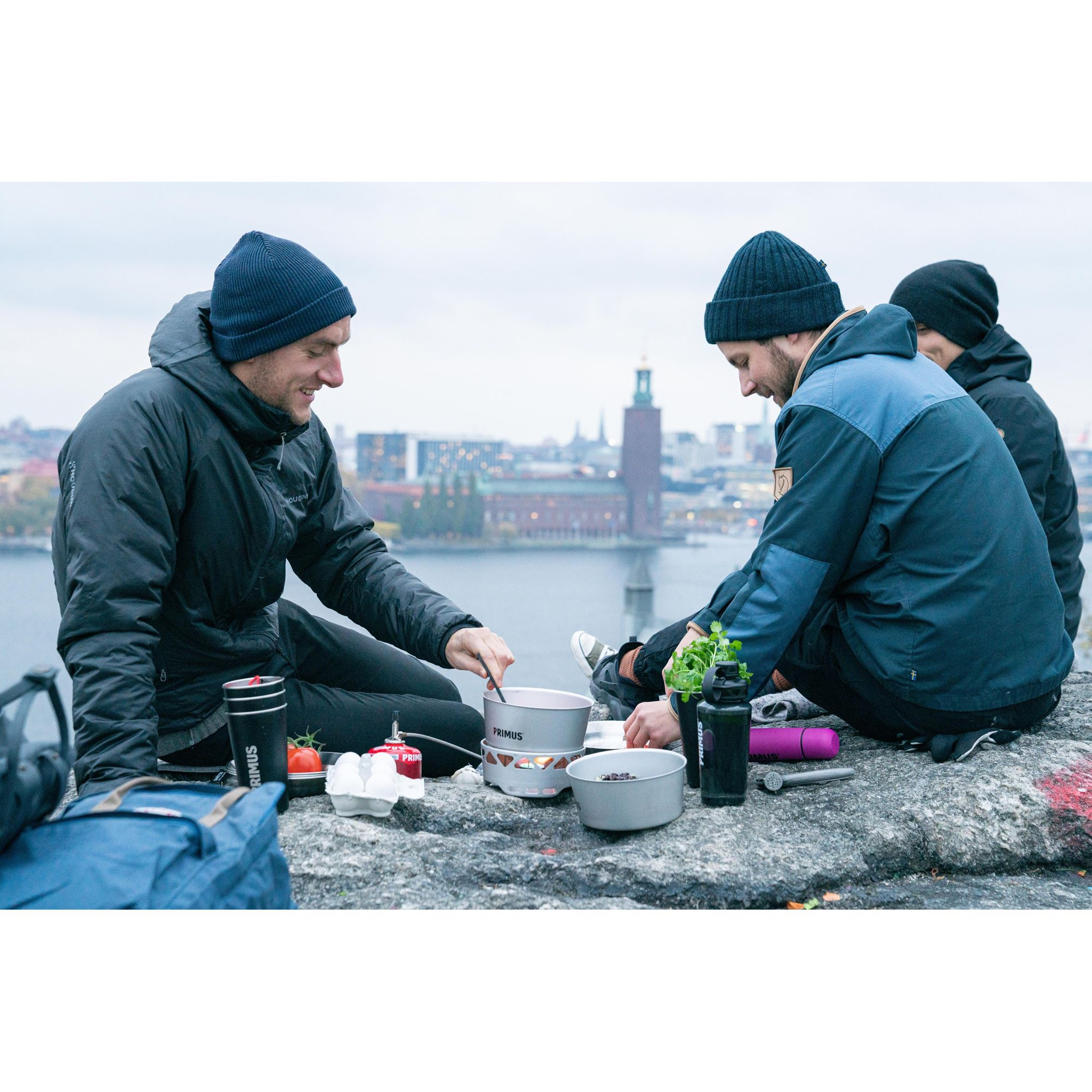 Primus Essential Stove System je jedinečný systém "vše v jednom" pro více osob, který je určen pro rodiny s batohem na zádech. Tento systém nabízí nejstabilnější a větru odolný vařič, 2 hrnce a pánev na vaření pro strávníky. Sestavení Vaší trekové kuchyně je snadné jako 1,2,3. Jednoduše (1) vyjměte pánev z obalu, poté (2) připojte plyn a (3) zapalte vařič. Uvařte si litr vody na kávu a ovesnou kaši na 2000W výkonném vařiči za méně než čtyři minuty a pak si usmažte ranní vajíčka na pánvi/pokličce, která má nepřilnavý teflonový povlak. Univerzální držák na horké hrnce usnadní jejich manipulaci. Sbalení sady je velice jednoduché, jednoduše otřete pánev - nepřilnavý povlak se velmi snadno čistí a pak všechny hrnce, pánve a vařič do sebe složíte. Vložte je do přepravního vaku který je čistý. Systém vařiče se dodává s integrovaným hořákem Laminar Flow a závětřím, dvěma hrnci, poklicí na pánev, držákem na hrnce a nylonovou transportní taškou. K dispozici ve dvou velikostech. Essential Stove System 1,3 l, který nasytí 1-3 osoby, zatímco Essential Stove System 2,3 l nasytí 2-5 osob.