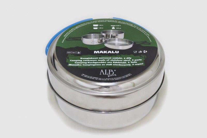 Nerezová sada Makalu je velice populární produkt již od počátku její výroby. Sada je vyrobena z kvalitního nerezu (CrNi 18/10). Pánev i misky mají lemovku a jsou opatřeny sklopnými držadly se silikonovou ochranou. Sada je opatřena prolisem na dně velké misky pro větší stabilitu na vařiči. Do sady se dá snadno zabalit například i plynová kartuše. Každá miska má rysku. Každá sada obsahuje i obal.