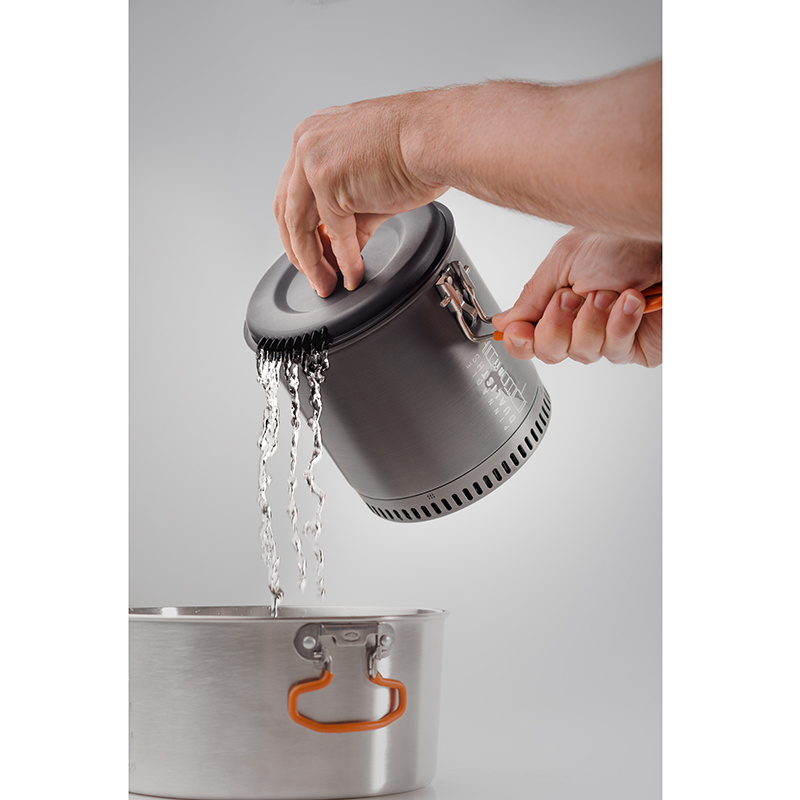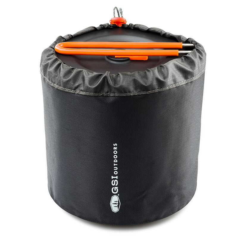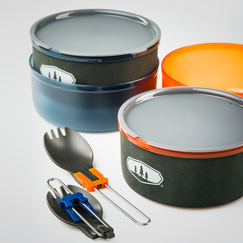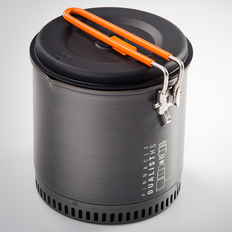 Updatovaná sada pro 2 osoby s nejvyšší úpravou povrchu Pinnacle, které získala mnoho outdoorových ocenění. Do sady lze umístit také plynový vařič GSI Outdoors Pinnacle Canister Stove i plynovou kartuši GSI Outdoors Isobutane Fuel 230g, která však stejně jako vařič není součástí balení. Perforovaná poklička z BPA FREE plastu umožňuje bezproblémový únik par z hrnce a zároveň slouží jako sítko například pro slití vody z těstovin. Pohodlná skládací rukojeť zapadne do přesně umístěných zarážek ať pro sbalení, tak i v pozici pro vaření. Unikátní hrnek a miska s nízkým těžištěm zabraňuje vylití. Víčko u misky lze použít jako pítko. Tato picí miska je po obvodu opatřena neoprénovým obalem. Nepromokavý obal celé sady lze použít jako nádobu na vodu nebo jako umyvadlo pro umytí nádobí. Úprava povrchu Pinnacle nabízí maximálně efektivní nepřilnavý 3-vrstvý Teflon® tvrzený technologií Radiance®, která je odolná proti poškrábání kovovým příborem.