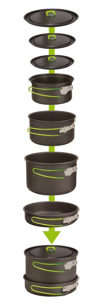 - Set campingového nádobí vyrobený z hliníku s anodizovaným povrchem. Sklopné rukojeti jsou vyrobeny z ocelového drátu, opatřeného silikonovou žáruvzdornou bužírkou, rukojeti poklic jsou plastové.