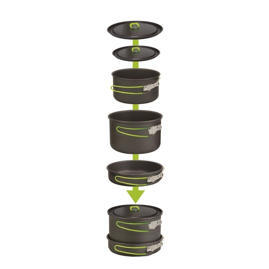 - Set campingového nádobí vyrobený z hliníku s anodizovaným povrchem.